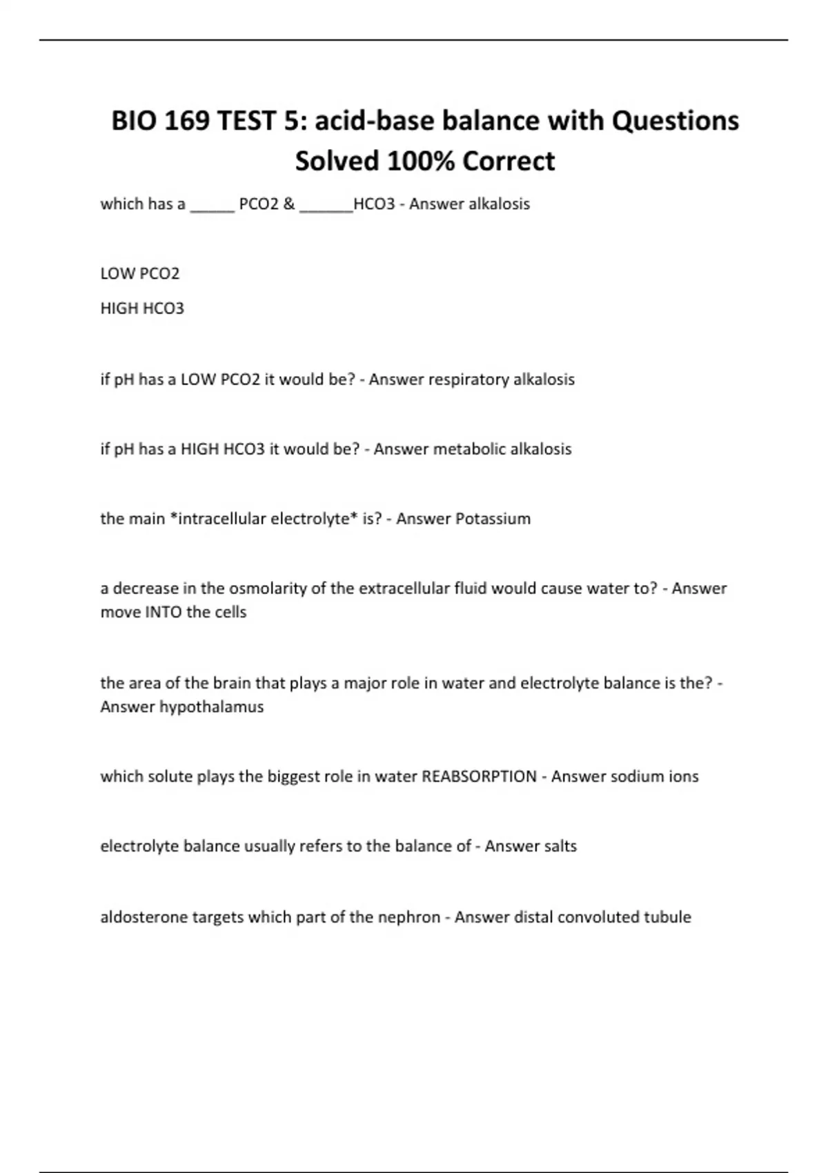 BIO 169 TEST 5: acid-base balance with Questions Solved 100% Correct