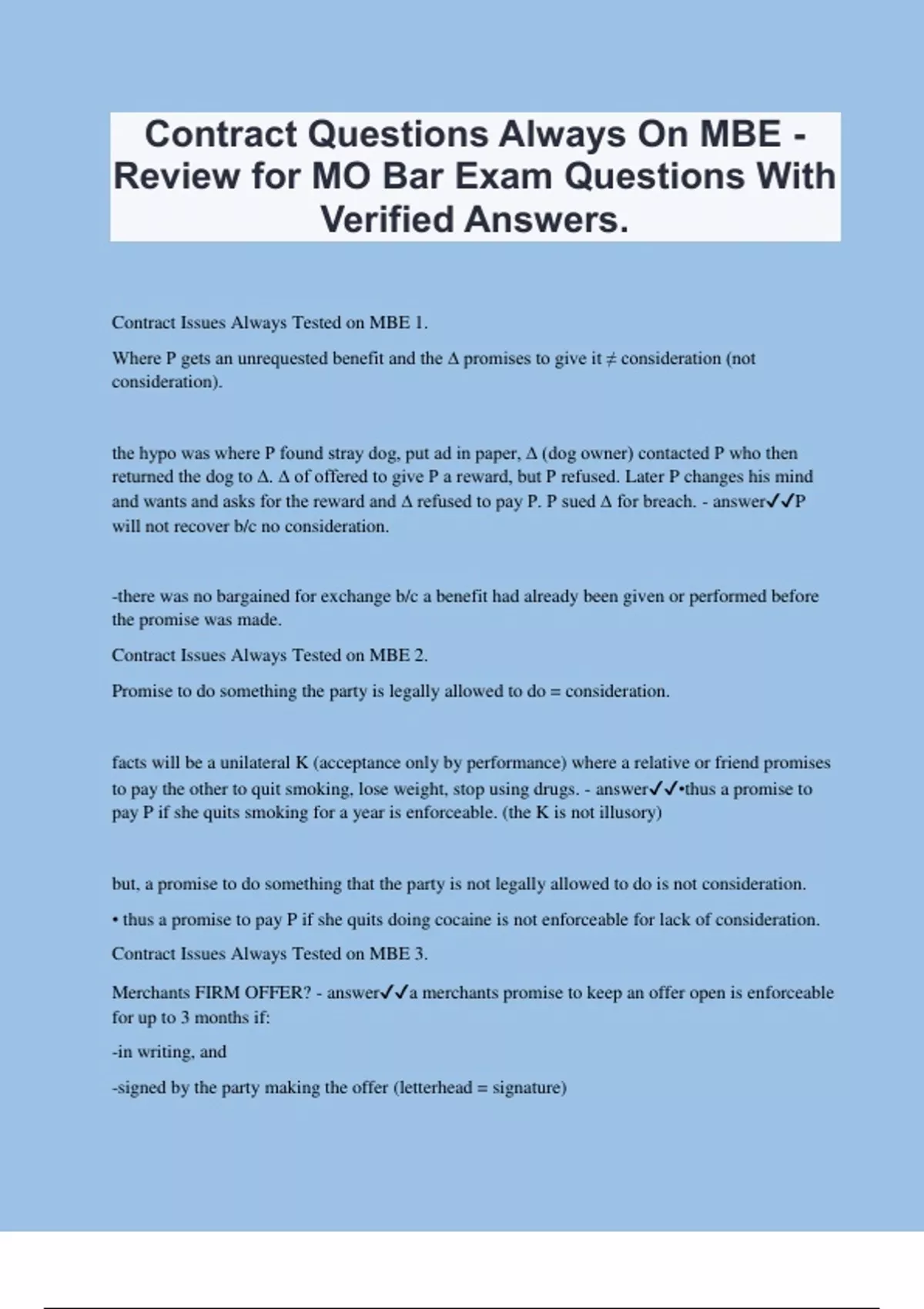 Contract Questions Always On MBE - Review for MO Bar Exam Questions With Verified Answers.