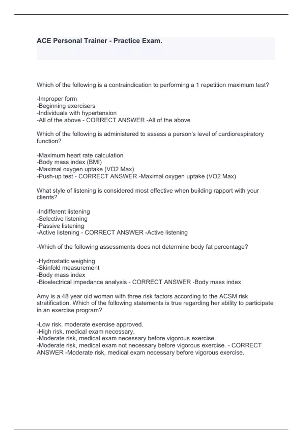 ACE Personal Trainer - Practice Exam. Which of the following is a contraindication to performing a 1 repetition maximum test? -Improper form -Beginning exercisers -Individuals with hypertension -All of the above - CORRECT ANSWER -All of the above Which of the following is administered to assess a person's level of cardiorespiratory function? -Maximum heart rate calculation -Body mass index (BMI) -Maximal oxygen uptake (VO2 Max) -Push-up test - CORRECT ANSWER -Maximal oxygen uptake (VO2 Max) What style of listening is considered most effective when building rapport with your clients? -Indifferent listening -Selective listening -Passive listening -Active listening - CORRECT ANSWER -Active listening -Which of the following assessments does not determine body fat percentage? -Hydrostatic weighing -Skinfold measurement -Body mass index -Bioelectrical impedance analysis - CORRECT ANSWER -Body mass index Amy is a 48 year old woman with three risk factors according to the ACSM risk stratification. Which of the following statements is true regarding her ability to participate in an exercise program? -Low risk, moderate exercise approved. -High risk, medical exam necessary. -Moderate risk, medical exam necessary before vigorous exercise. -Moderate risk, medical exam not necessary before vigorous exercise. - CORRECT ANSWER -Moderate risk, medical exam necessary before vigorous exercise. Which of the following exercises is most appropriate to include in a program for a client wishing to improve core stabilization? -Rocking quadruped -Single-leg body-weight squat with core activation -Bend and lift squat with core activation -Glute bridge - CORRECT ANSWER -Rocking quadruped A one-repetition maximum test evaluates which type of strength? -Relative strength -Endurance -Power -Absolute strength - CORRECT ANSWER -Absolute strength