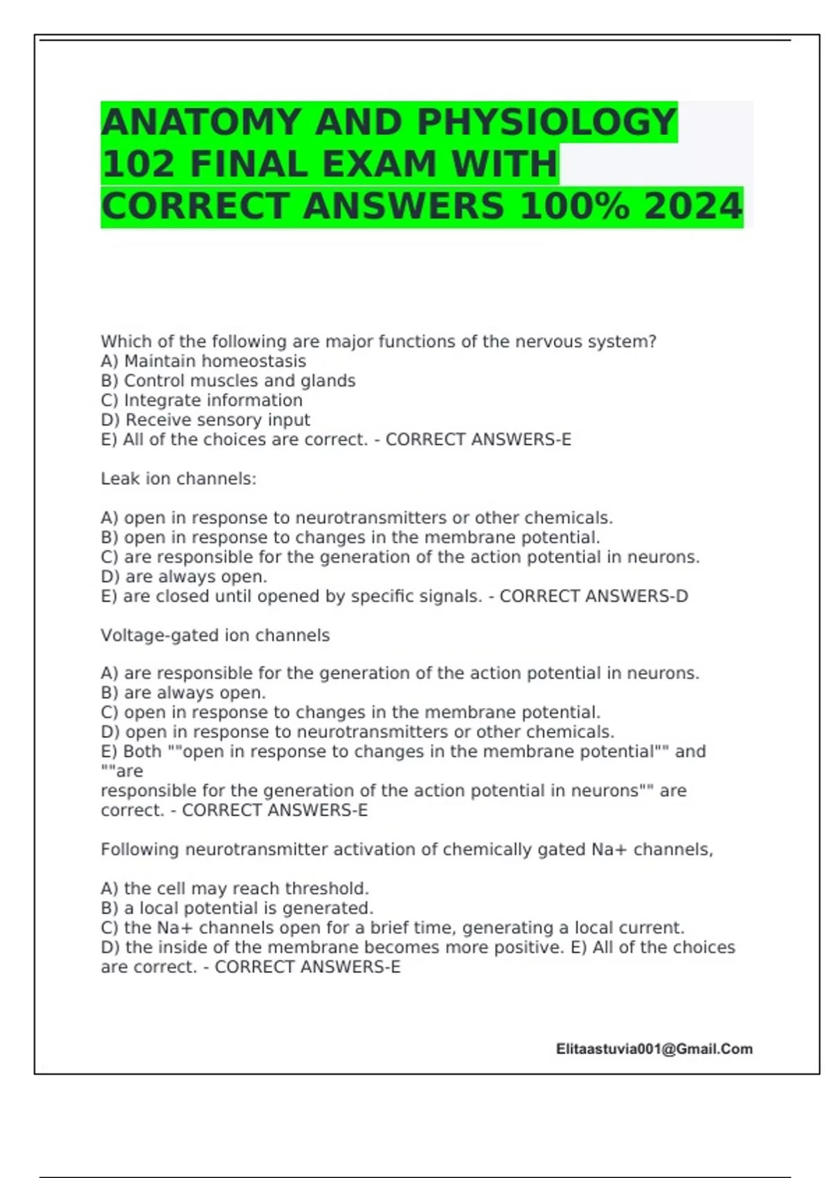 ANATOMY AND PHYSIOLOGY 102 FINAL EXAM WITH CORRECT ANSWERS 100% 2024