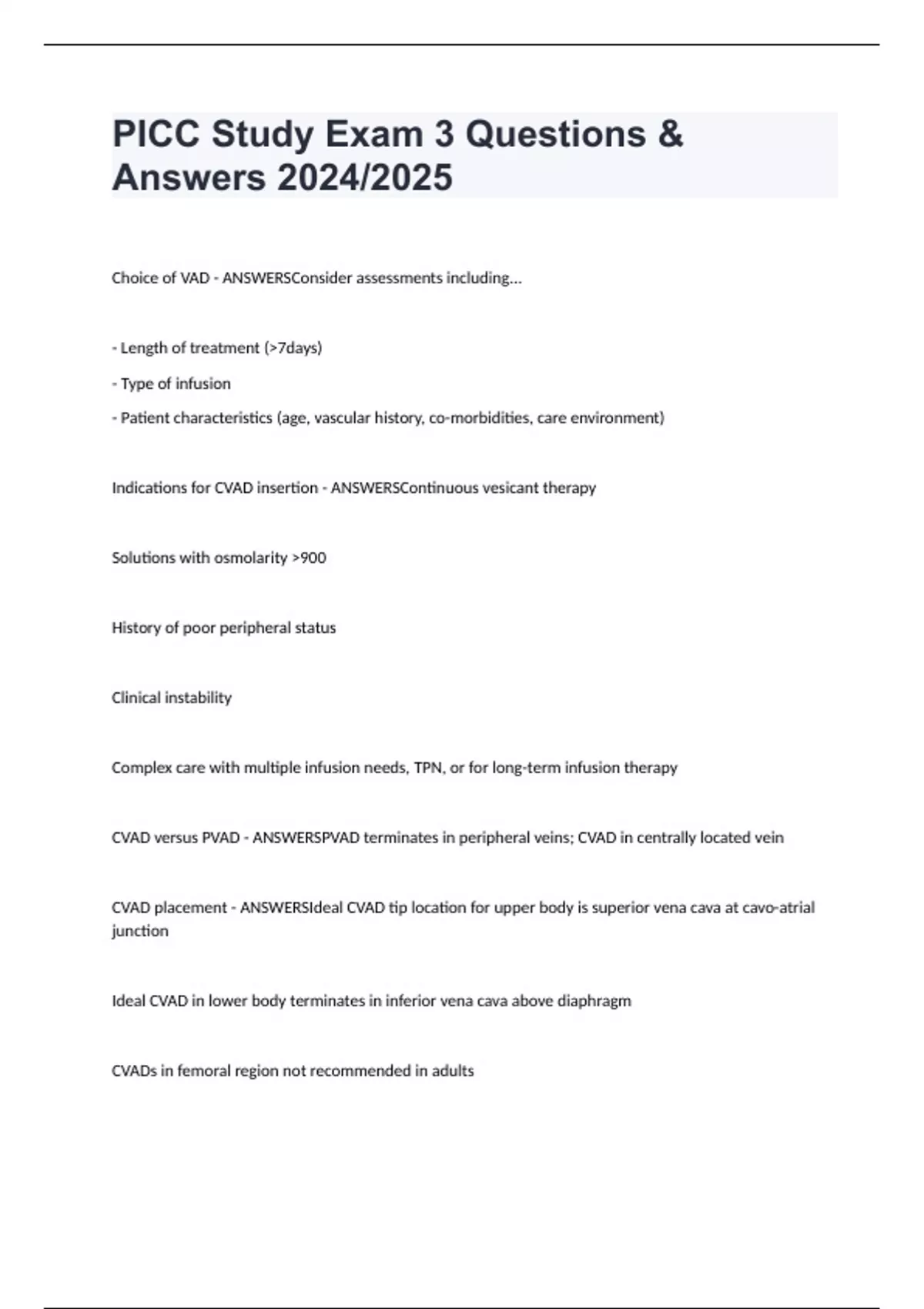 PICC Study Exam 3 Questions & Answers 2024/2025 Choice of VAD - ANSWERSConsider assessments including... - Length of treatment (>7days) - Type of infusion - Patient characteristics (age, vascular history, co-morbidities, care environment) Indications for CVAD insertion - ANSWERSContinuous vesicant therapy Solutions with osmolarity >900 History of poor peripheral status Clinical instability Complex care with multiple infusion needs, TPN, or for long-term infusion therapy CVAD versus PVAD - ANSWERSPVAD terminates in peripheral veins; CVAD in centrally located vein CVAD placement - ANSWERSIdeal CVAD tip location for upper body is superior vena cava at cavo-atrial junction Ideal CVAD in lower body terminates in inferior vena cava above diaphragm CVADs in femoral region not recommended in adults