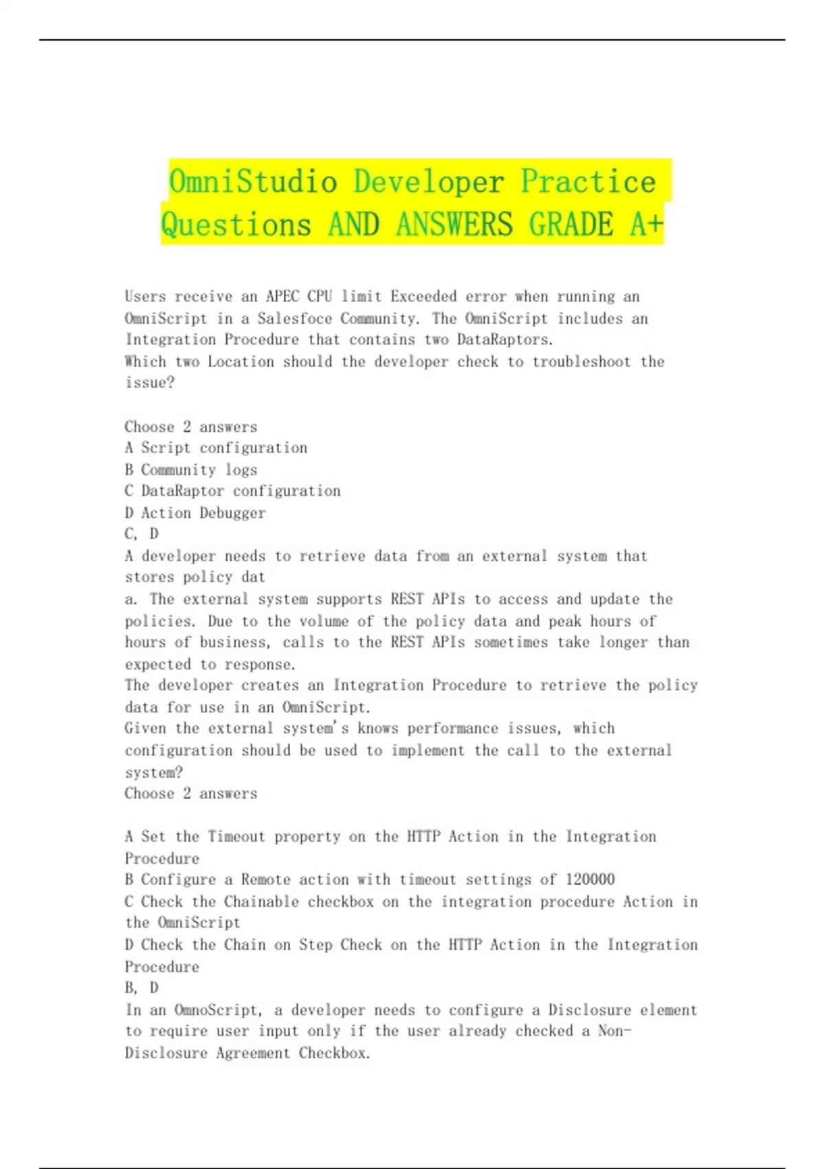 Users receive an APEC CPU limit Exceeded error when running an OmniScript in a Salesfoce Community. The OmniScript includes an Integration Procedure that contains two DataRaptors. Which two Location should the developer check to troubleshoot the issue? Choose 2 answers A Script configuration B Community logs C DataRaptor configuration D Action Debugger C, D A developer needs to retrieve data from an external system that stores policy dat a. The external system supports REST APIs to access and update the policies. Due to the volume of the policy data and peak hours of hours of business, calls to the REST APIs sometimes take longer than expected to response. The developer creates an Integration Procedure to retrieve the policy data for use in an OmniScript. Given the external system's knows performance issues, which configuration should be used to implement the call to the external system? Choose 2 answers A Set the Timeout property on the HTTP Action in the Integration Procedure B Configure a Remote action with timeout settings of 120000 C Check the Chainable checkbox on the integration procedure Action in the OmniScript D Check the Chain on Step Check on the HTTP Action in the Integration Procedure B, D In an OmnoScript, a developer needs to configure a Disclosure element to require user input only if the user already checked a Non-Disclosure Agreement Checkbox. How should the developer configure the conditional view to meet this requirement? A Show element if true B Disable read only if true C Set element to optional if false D Set element to require if true A An OmniScript updates data from one Salesforce record, but when it completes, only some of the data is updated in Salesforce. A DataRaptor Load saves the dat a. What error could cause this behavior? Choose 2 answers A The fields that are not updated are read only in Salesforce. B In the DataRaptor Load, in the Preview tab, the Record is from the wrong record type. C The input JSON paths In the DataRaptor Load do not match the JSON from the OmniScript. D ContextId is misspelled in the merge code that passes the Recordld to the DataRaptor A, C The OmniScript must retrieve device details stored in the Asset object and then call an external system to send troubleshooting commands via REST API to the device. Which two OmniScript element should the developer use to configure this functionality? A DataRaptor Extract Action B REST API Action C Navigation Action D SOQL Action E HTTP Action A, E A developer creates an Integration Procedure with a Set Values and a DataRaptor Extract Action that requires AccountId as a key. When the developer previews the Integration Procedure, the developer enters the AccountId correctly and execute the Preview. The developer sees the data extract by the DataRaptor in the Debug Log, but the response is empty. What is the likely cause of this issue? A The DataRaptor Action did not have the add response Ro Response JSON property set to true. CONTINUED........