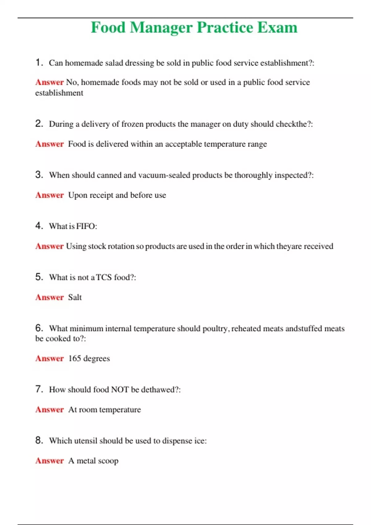 Food Manager Practice Exam (Latest 2024) Questions With Complete Grade A+ Answers