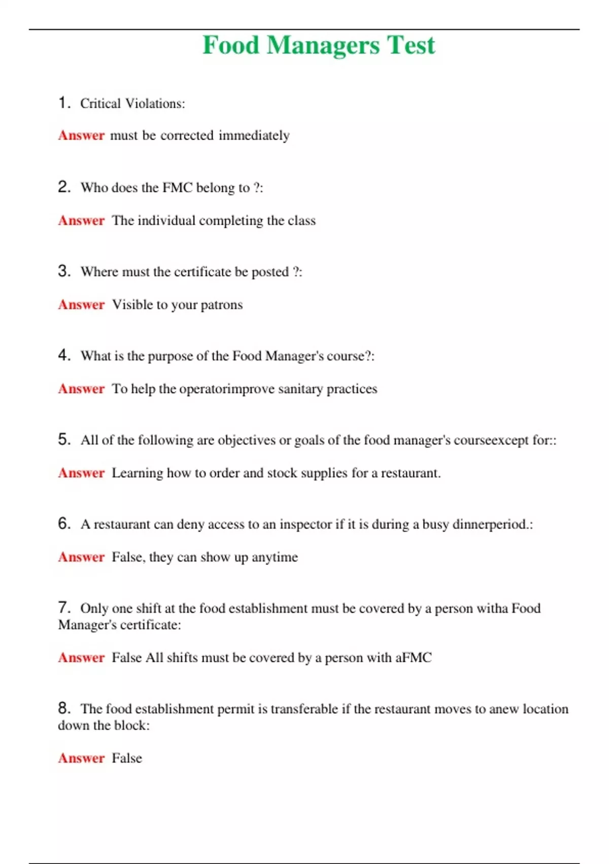 Food Managers Test (Latest 2024) Questions With Complete Grade A+ Answers