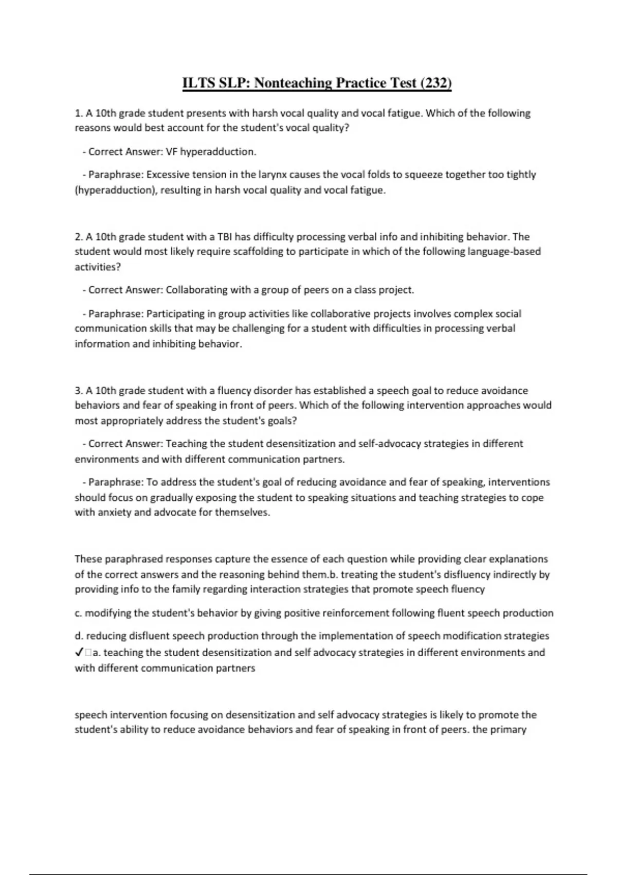 ILTS SLP: Nonteaching Practice Test (232) 1. A 10th grade student presents with harsh vocal quality and vocal fatigue. Which of the following reasons would best account for the student's vocal quality? - Correct Answer: VF hyperadduction. - Paraphrase: Excessive tension in the larynx causes the vocal folds to squeeze together too tightly (hyperadduction), resulting in harsh vocal quality and vocal fatigue. 2. A 10th grade student with a TBI has difficulty processing verbal info and inhibiting behavior. The student would most likely require scaffolding to participate in which of the following language-based activities? - Correct Answer: Collaborating with a group of peers on a class project. - Paraphrase: Participating in group activities like collaborative projects involves complex social communication skills that may be challenging for a student with difficulties in processing verbal information and inhibiting behavior. 3. A 10th grade student with a fluency disorder has established a speech goal to reduce avoidance behaviors and fear of speaking in front of peers. Which of the following intervention approaches would most appropriately address the student's goals? - Correct Answer: Teaching the student desensitization and self-advocacy strategies in different environments and with different communication partners. - Paraphrase: To address the student's goal of reducing avoidance and fear of speaking, interventions should focus on gradually exposing the student to speaking situations and teaching strategies to cope with anxiety and advocate for themselves. These paraphrased responses capture the essence of each question while providing clear explanations of the correct answers and the reasoning behind them.b. treating the student's disfluency indirectly by providing info to the family regarding interaction strategies that promote speech fluency c. modifying the student's behavior by giving positive reinforcement following fluent speech production d. reducing disfluent speech production through the implementation of speech modification strategies ️a. teaching the student desensitization and self advocacy strategies in different environments and with different communication partners speech intervention focusing on desensitization and self advocacy strategies is likely to promote the student's ability to reduce avoidance behaviors and fear of speaking in front of peers. the primary purpose of desensitization strategies is to systematically address a student's fear of disfluency whereas self advocacy strategies support a students ability to disclose their identity as an individual with a fluency disorder to communication partners. A 2nd grade student presents with highly unintelligible speech and a significant restricted speech sound repertoire. The SLP decides to use the complexity approach to address the students speech sound production. which of the following student outcomes is most likely to result from this intervention approach? a. the student will produce speech sounds that are targeted in a developmental sequence b. the student will produce meaningful phrases with increased intelligibility to promote functional communication c. the student will develop increased phonological awareness which will indirectly improve speech sound production d. the student will more rapidly generalize phonological principles to other untreated speech sounds ️d. the student will more rapidly generalize phonological principles to other untreated speech sounds The complexity approach is an intervention that can be used to address functional phonological impairment. research indicated that more feature generalization is likely to occur when more complexity input is targeted. therefore the SLP is likely to use the approach to more rapidly affect phonological change within a students phonological system. A 3rd grade student with a language impairment has difficulty identifying and self correcting grammatical errors. The student is most likely to require support with which of the following classroom activities? a. sorting vocab words into categories b. sharing background knowledge with a peer c. working collaboratively in a small group d. using a checklist to edit written work ️d. using a checklist to edit written work because editing requires matelinguistic awareness of writing form and content as well as knowledge and use of grammatical structures a student who has difficulty with these skills would require additional support. A checklist is unlikely to promote a student's editing abilities especially if they struggle to identify grammatical errors. a 3rd grade student with cochlear implants hears speech through which of the following processes? a. sounds are converted into electrical signals and transmitted to the auditory nerve. b. sounds are collected and amplified. and then transmitted through the ear canal. c. sounds are conducted directly to the cochlea through bone conduction d. sounds are transmitted though a frequency modulation signal directly to a reciever ️a. sounds are converted into electrical signals and transmitted to the auditory nerve. cochlear implants are digital signal processing devices that convert sounds into digital signals that are transmitted to electrodes in the inner ear. The electrodes deliver electrical stimulation to the auditory nerve, sending signals to the brain that are interpreted as sounds. A 3rd grade teacher reports that a student who is an ELL closely observes students i