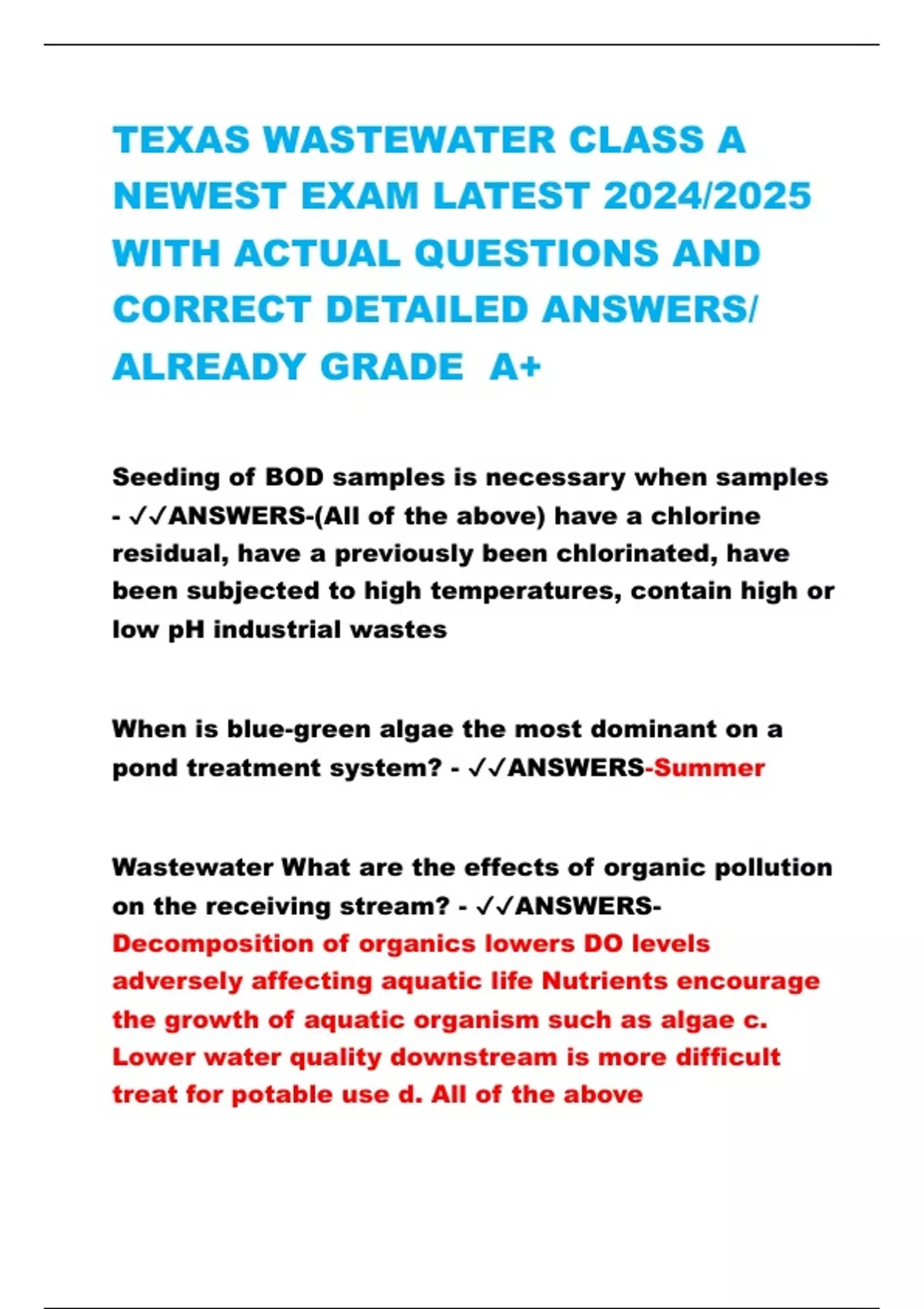TEXAS WASTEWATER CLASS A NEWEST EXAM LATEST 2024/2025 WITH ACTUAL QUESTIONS AND CORRECT DETAILED ANSWERS/ ALREADY GRADE A+