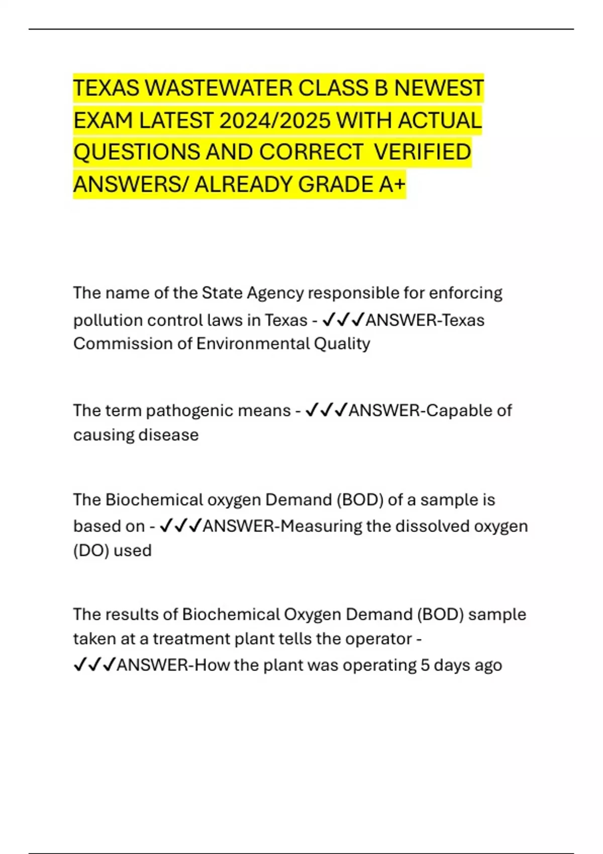 TEXAS WASTEWATER CLASS B NEWEST EXAM LATEST 2024/2025 WITH ACTUAL QUESTIONS AND CORRECT VERIFIED ANSWERS/ ALREADY GRADE A+ The name of the State Agency responsible for enforcing pollution control laws in Texas - ANSWER-Texas Commission of Environmental Quality The term pathogenic means - ANSWER-Capable of causing disease The Biochemical oxygen Demand (BOD) of a sample is based on - ANSWER-Measuring the dissolved oxygen (DO) used The results of Biochemical Oxygen Demand (BOD) sample taken at a treatment plant tells the operator - ANSWER-How the plant was operating 5 days ago Which of the following are dangerous gasses that are likely to be present in lift stations and manholes? - ANSWER-Natural gas, gasoline fumes, hydrogen sulfide and carbon dioxide The minimum separation between sewer lines and potable water lines is - ANSWER-9 feet A licensed wastewater operator is a professional - ANSWER-consistently does best job possible, practices personal safety, strives to improve job knowledge, strives to keep the plant and collection system in the best appearance and working order An important step in testing a sample for Total Suspended Solids is - ANSWER-Filtering a sample A preferred hydraulic method of cleaning sewer lines is - ANSWER-Hydro Jet Cleaner Ways to reduce bad odors coming from a collection system - ANSWER-routinely cleaning slow running or low flow lines, adding chlorine or hydrogen peroxide to the collection system Types of pipe that are commonly used in wastewater collection system - ANSWER-ductile iron, Poly Vinyl Chloride (PVC) Before entering a confined space a worker should - ANSWER-Use approved monitoring device and check for the presence of dangerous gasses, ventilate the space with a blower, wear a safety harness and attach a life line A properly designed and operated primary sedimentation tank should remove _____ percent of incoming BOD - ANSWER-30-40% Devices that may be used to determine the level of sewage in a lift station - ANSWER-air bubbler, floats, electrodes, Acoustic (sonic) What is the most important role of aerobic bacteria in the treatment of wastewater? - ANSWER-decompose organic matter