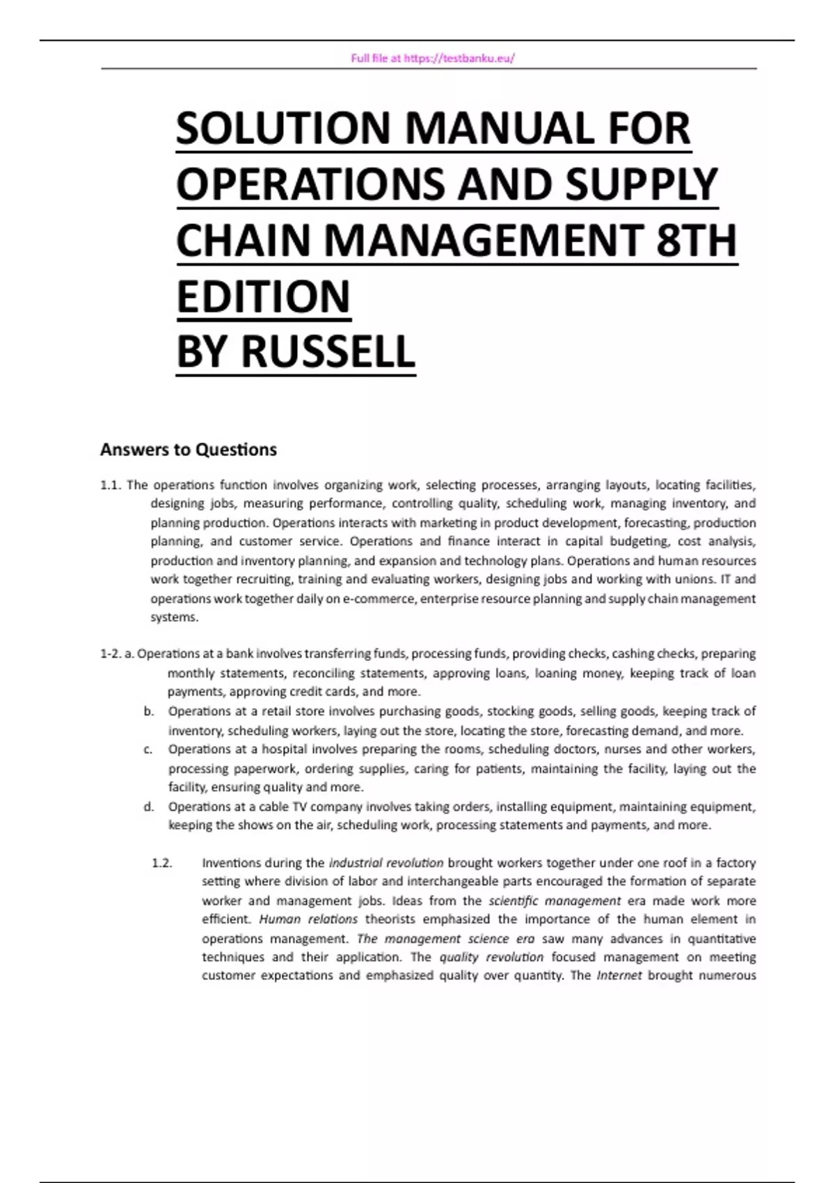 SOLUTION MANUAL FOR OPERATIONS AND SUPPLY CHAIN MANAGEMENT 8TH EDITION BY RUSSELL