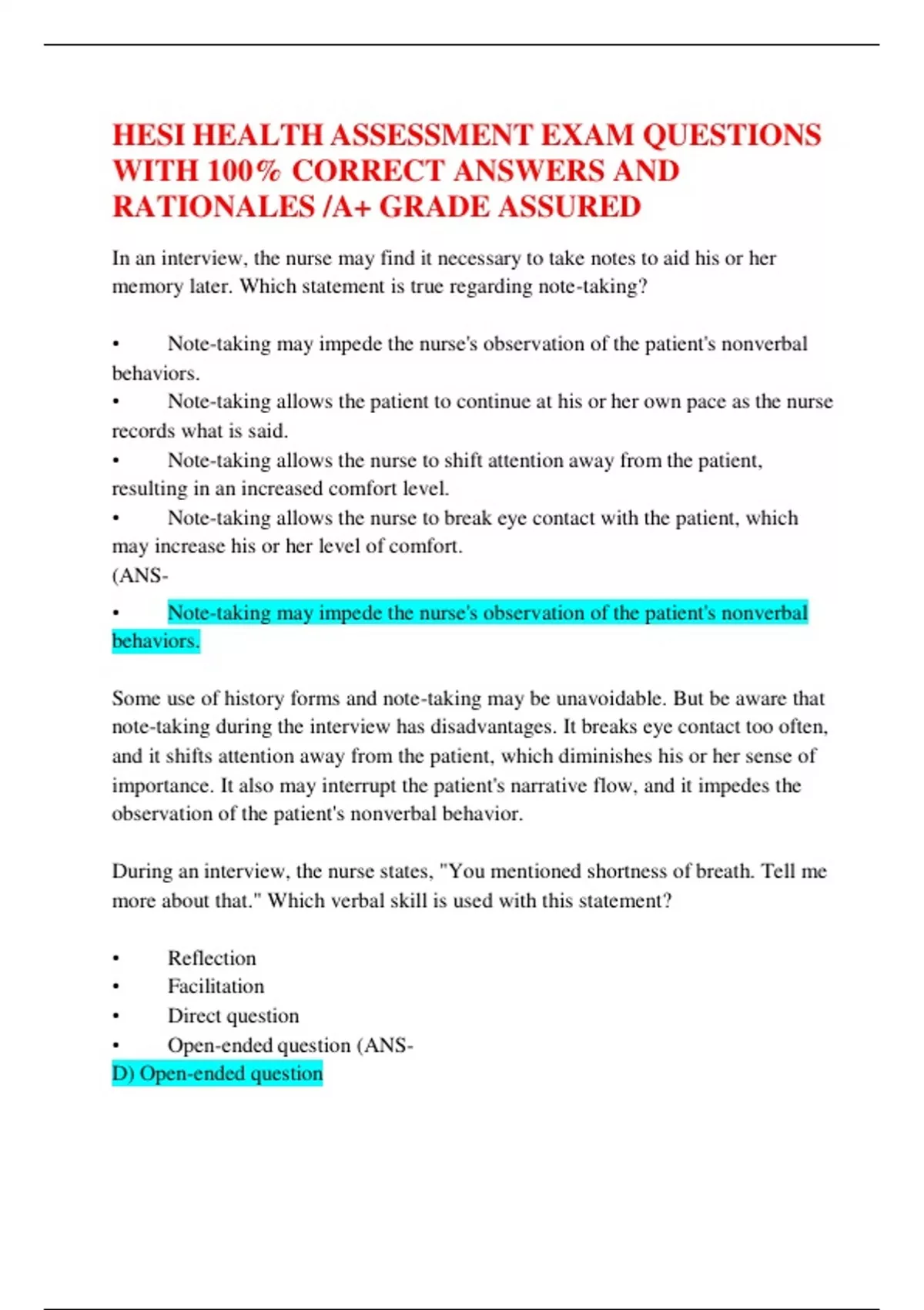HESI HEALTH ASSESSMENT EXAM QUESTIONS WITH 100% CORRECT ANSWERS AND RATIONALES A+ GRADE ASSURED