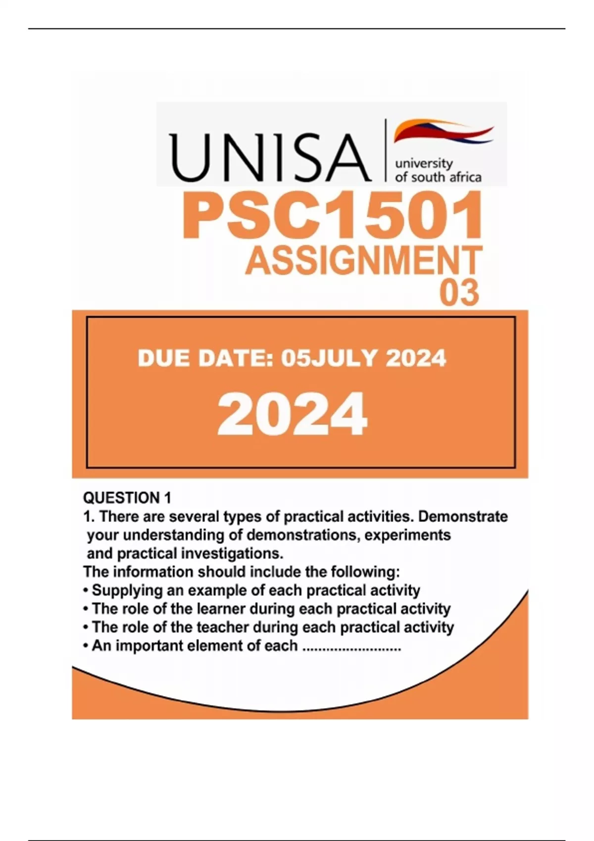 PSC1501 ASSIGNMENT: 03..DUE DATE: 05 July 2024 QUESTION 1 1. There are several types of practical activities. Demonstrate your understanding of demonstrations, experiments and practical investigations. The information should include the following: • Supplying an example of each practical activity • The role of the learner during each practical activity • The role of the teacher during each practical activity • An important element of each practical activity to consider.