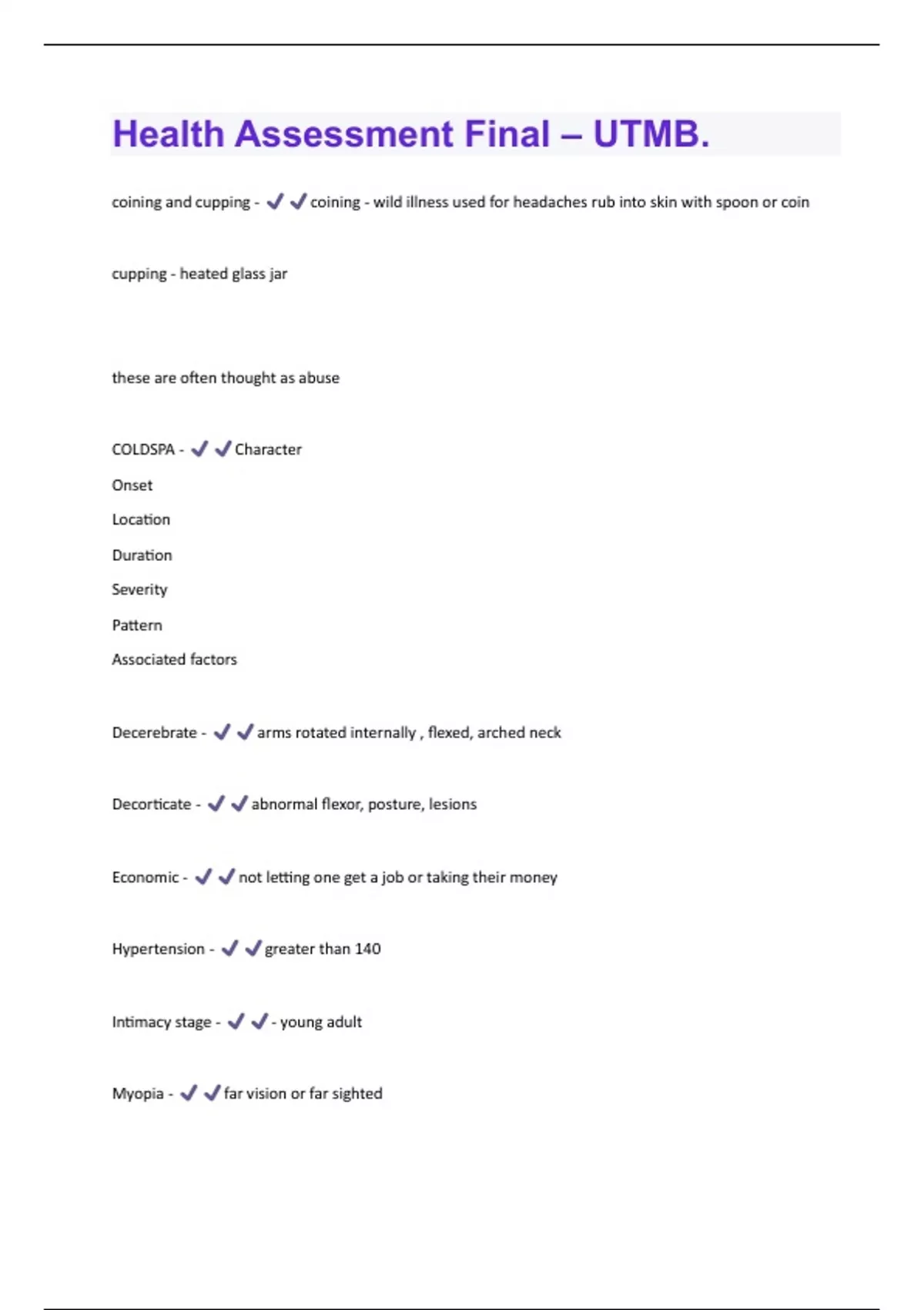 coining and cupping - coining - wild illness used for headaches rub into skin with spoon or coin cupping - heated glass jar these are often thought as abuse COLDSPA - Character Onset Location Duration Severity Pattern Associated factors Decerebrate - arms rotated internally , flexed, arched neck Decorticate - abnormal flexor, posture, lesions Economic - not letting one get a job or taking their money Hypertension - greater than 140 Intimacy stage - - young adult Myopia - far vision or far sightedNormal temperatures - 98.6 ºF or 37 ºC 97.6ºF or 36.5 - axillary Physical examination order - Inspect palpate percuss auscultate Except for the abdomen which is: inspect, auscultate, percuss and palpate Physical violence - restraints, abuser refuses to provide help if in need presbyopia - near sighted Pulse - 60-100 less than 60 - bradycardia higher than 100 - tachycardia Safety plan - if you think someone is in danger ask if they have a safety plan or do a danger assessmen
