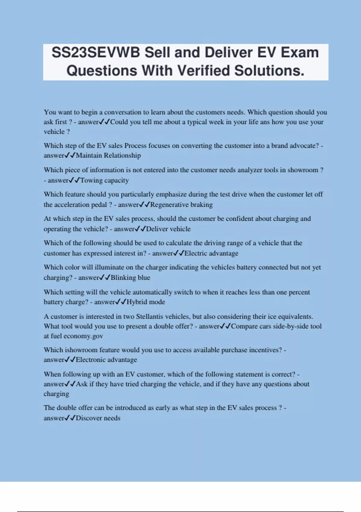 SS23SEVWB Sell and Deliver EV Exam Questions With Verified Solutions.