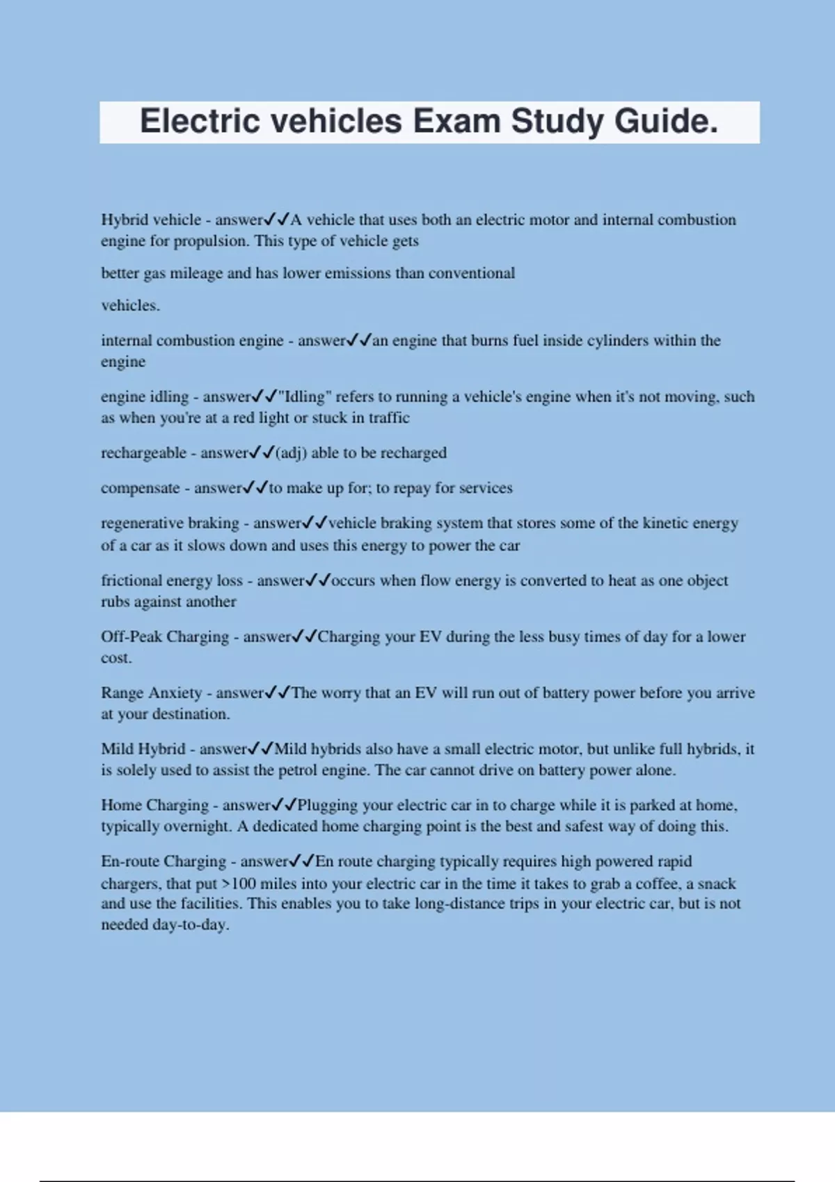 Electric vehicles Exam Study Guide.