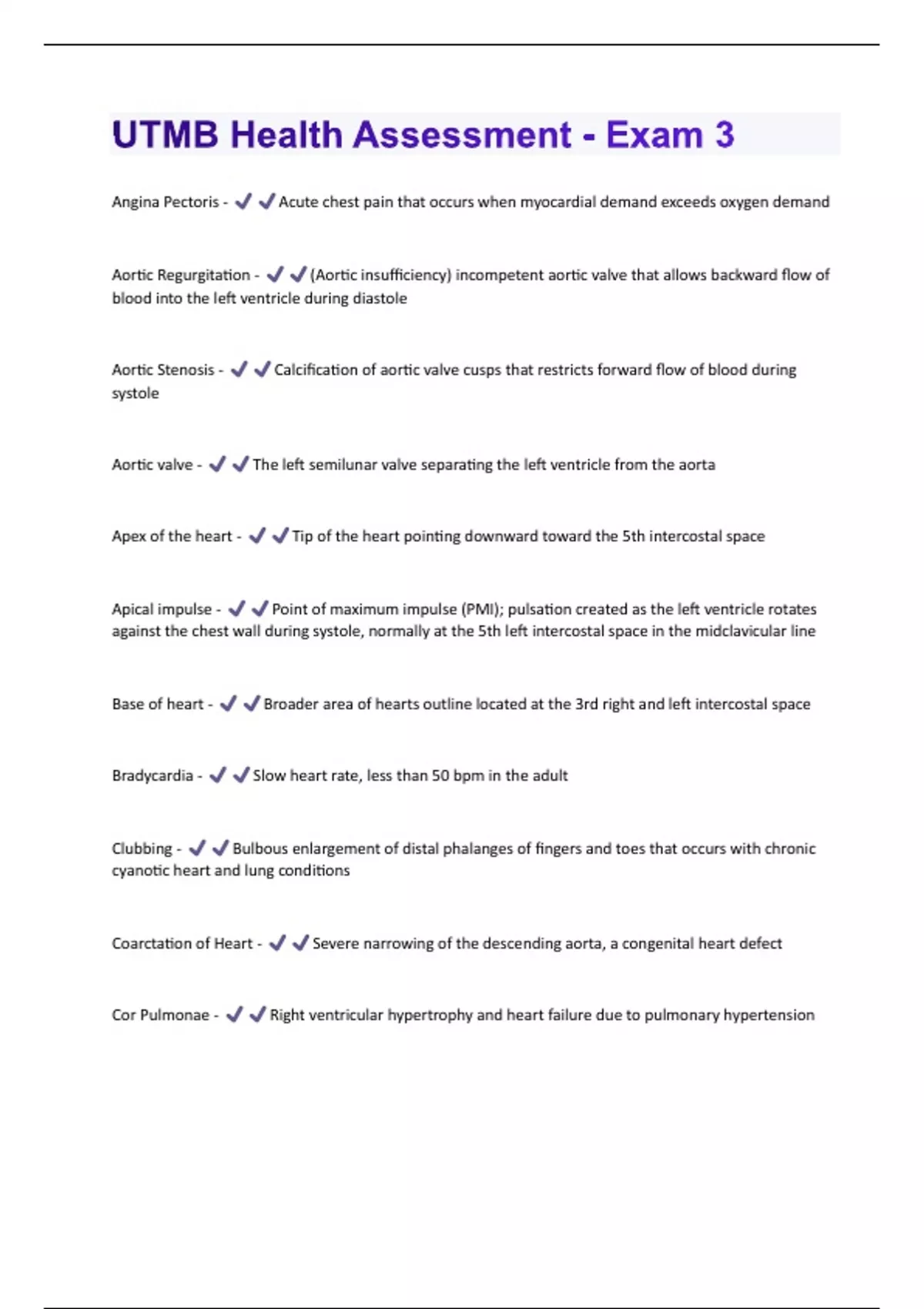 Angina Pectoris - Acute chest pain that occurs when myocardial demand exceeds oxygen demand Aortic Regurgitation - (Aortic insufficiency) incompetent aortic valve that allows backward flow of blood into the left ventricle during diastole Aortic Stenosis - Calcification of aortic valve cusps that restricts forward flow of blood during systole Aortic valve - The left semilunar valve separating the left ventricle from the aorta Apex of the heart - Tip of the heart pointing downward toward the 5th intercostal space Apical impulse - Point of maximum impulse (PMI); pulsation created as the left ventricle rotates against the chest wall during systole, normally at the 5th left intercostal space in the midclavicular line Base of heart - Broader area of hearts outline located at the 3rd right and left intercostal space Bradycardia - Slow heart rate, less than 50 bpm in the adult Clubbing - Bulbous enlargement of distal phalanges of fingers and toes that occurs with chronic cyanotic heart and lung conditions Coarctation of Heart - Severe narrowing of the descending aorta, a congenital heart defect Cor Pulmonae - Right ventricular hypertrophy and heart failure due to pulmonary hypertensionCyanosis - Dusky blue mottling of the skin and mucous membranes due to excessive amount of reduced hemoglobin in the blood Diastole - The hearts filling phase Dyspnea - Difficult, labored breathing Edema - Swelling of legs or dependent body part due to increased interstitial fluid Erbs point - Traditional auscultating area in the 3rd intercostal space