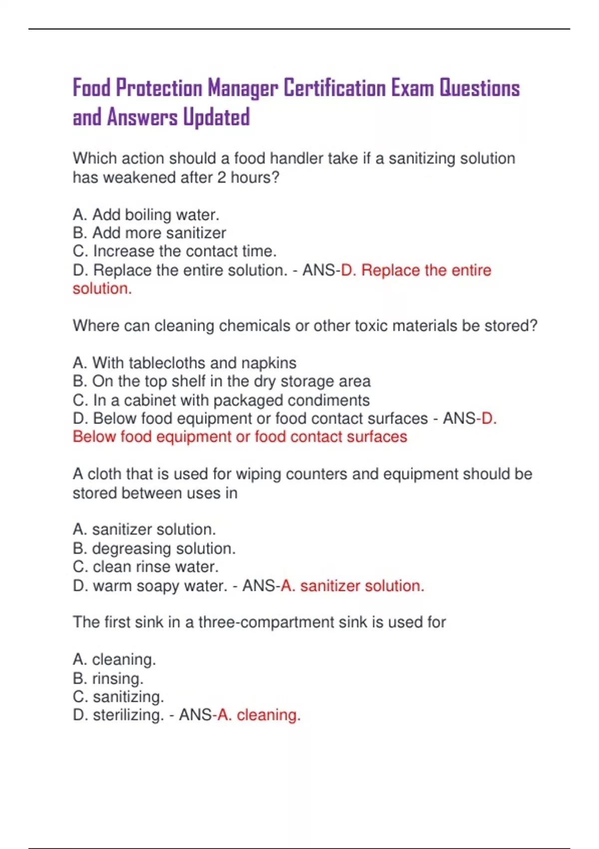 Food Protection Manager Certification Exam Questions and Answers Updated Which action should a food handler take if a sanitizing solution has weakened after 2 hours? A. Add boiling water. B. Add more sanitizer C. Increase the contact time. D. Replace the entire solution. - ANS-D. Replace the entire solution. Where can cleaning chemicals or other toxic materials be stored? A. With tablecloths and napkins B. On the top shelf in the dry storage area C. In a cabinet with packaged condiments D. Below food equipment or food contact surfaces - ANS-D. Below food equipment or food contact surfaces A cloth that is used for wiping counters and equipment should be stored between uses in A. sanitizer solution. B. degreasing solution. C. clean rinse water. D. warm soapy water. - ANS-A. sanitizer solution. The first sink in a three-compartment sink is used for A. cleaning. B. rinsing. C. sanitizing. D. sterilizing. - ANS-A. cleaning. Which food must be cooked to a minimum internal temperature of 155 degrees F. (68 C) for 15 seconds? A. Pork roast B. Fish fillets C. Ground beef patties D. Stuffed peppers - ANS-C. Ground beef patties The first step in cooling a deep pan of rice is to.... A. let the pan sit on the counter for an hour to cool. B. cover the rice tightly with foil. C. place the pan of rice in the walk-in freezer. D. put the rice into shallow pans. - ANS-D. put the rice into shallow pans. A cook working for the local nursing home, wants to serve grilled salmon with Hollandaise sauce to the residents. What type of eggs must they use in the sauce? A. Shell B. Grade A C. Pasteurized D. Fortified - ANS-C. Pasteurized To which minimum internal temperature should chopped or minced fish be cooked? A. 125 degree F. (52 C) B. 135 degree F. (57 C) C. 145 degree F. (63 C) D. 155 degree F. (68 C) - ANS-D. 155 degree F. (68 C) Which practice is an effective method of preventing crosscontamination.