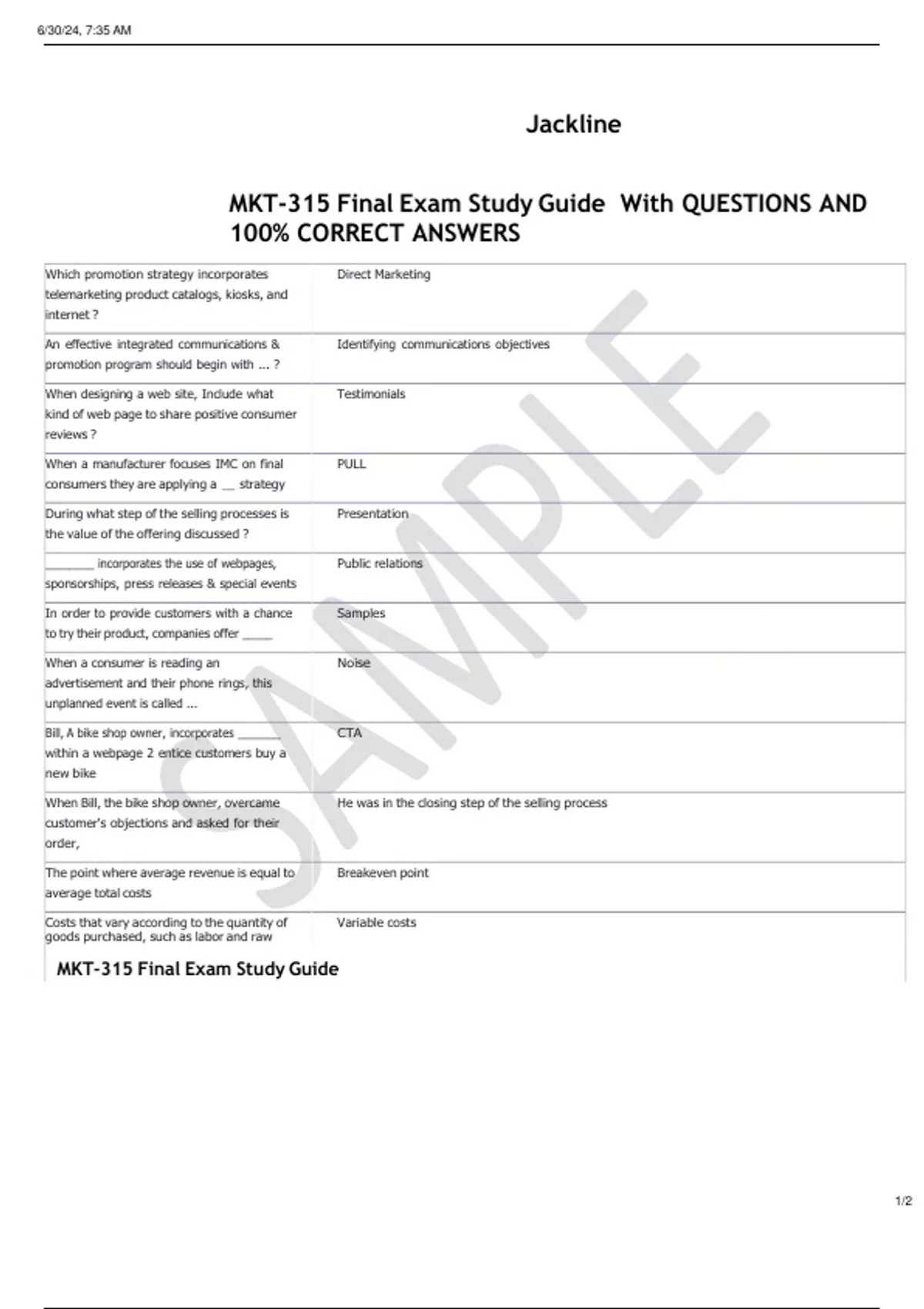 MKT-315 Final Exam Study Guide With QUESTIONS AND 100% CORRECT ANSWERS
