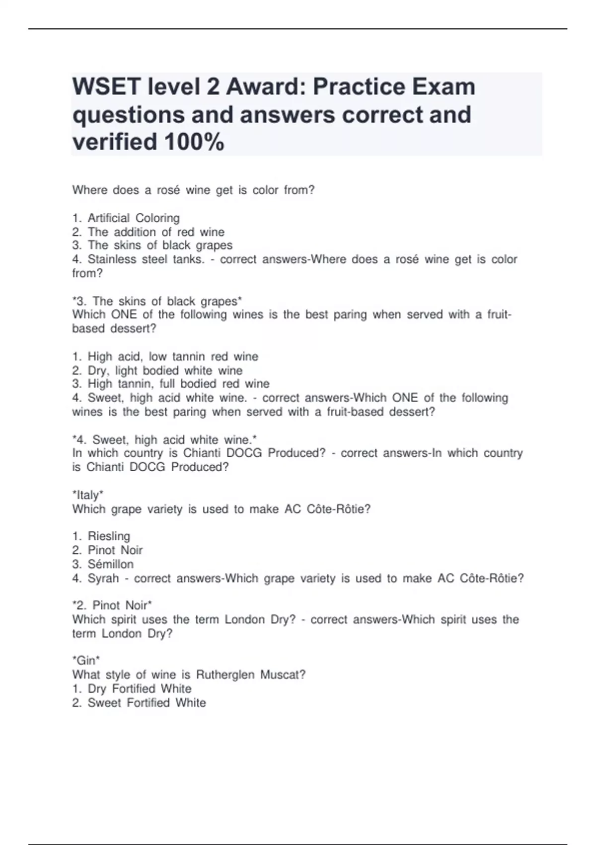 WSET level 2 Award: Practice Exam questions and answers correct and verified 100% WSETm levelm 2m Award:m Practicem Examm questionsm andm answersm correctm andm verifiedm 100% Wherem doesm am rosém winem getm ism colorm from? 1.m Artificialm Coloring 2.m Them additionm ofm redm wine 3.m Them skinsm ofm blackm grapes 4.m Stainlessm steelm tanks.m -m correctm answers-Wherem doesm am rosém winem getm ism colorm from? *3.m Them skinsm ofm blackm grapes* Whichm ONEm ofm them followingm winesm ism them bestm paringm whenm servedm withm am fruit-basedm dessert? 1.m Highm acid,m lowm tanninm redm wine 2.m Dry,m lightm bodiedm whitem wine 3.m Highm tannin,m fullm bodiedm redm wine 4.m Sweet,m highm acidm whitem wine.m -m correctm answers-Whichm ONEm ofm them followingm winesm ism them bestm paringm whenm servedm withm am fruit-basedm dessert? *4.m Sweet,m highm acidm whitem wine.* Inm whichm countrym ism Chiantim DOCGm Produced?m -m correctm answers-Inm whichm countrym ism Chiantim DOCGm Produced? *Italy* Whichm grapem varietym ism usedm tom makem ACm Côte-Rôtie? 1.m Riesling 2.m Pinotm Noir 3.m Sémillon 4.m Syrahm -m correctm answers-Whichm grapem varietym ism usedm tom makem ACm Côte-Rôtie? *2.m Pinotm Noir* Whichm spiritm usesm them termm Londonm Dry?m -m correctm answers-Whichm spiritm usesm them termm Londonm Dry? *Gin* Whatm stylem ofm winem ism Rutherglenm Muscat? 1.m Drym Fortifiedm White 2.m Sweetm Fortifiedm White 3.m Drym Fortifiedm Red 4.m Sweetm Fortifiedm Redm -m correctm answers-Whatm stylem ofm winem ism Rutherglenm Muscat? *2.m Sweetm Fortifiedm White* Inm whichm countrym ism them countym ofm Sonoma?m -m correctm answers-Inm whichm countrym ism them countym ofm Sonoma? *USA* Whichm gasm ism givenm offm duringm alcoholicm fermentation?m -m correctm answers-Whichm gasm ism givenm offm duringm alcoholicm fermentation?