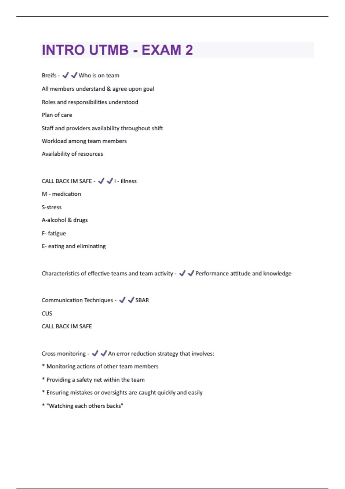 Breifs - Who is on team All members understand & agree upon goal Roles and responsibilities understood Plan of care Staff and providers availability throughout shift Workload among team members Availability of resources CALL BACK IM SAFE - I - illness M - medication S-stress A-alcohol & drugs F- fatigue E- eating and eliminating Characteristics of effective teams and team activity - Performance attitude and knowledge Communication Techniques - SBAR CUS CALL BACK IM SAFE Cross monitoring - An error reduction strategy that involves: * Monitoring actions of other team members * Providing a safety net within the team * Ensuring mistakes or oversights are caught quickly and easily * "Watching each others backs"CUS - I am CONCERNED, UNCOMFORTABLE, this is a SAFETY ISSUE. debrief - Was communication clear? Role & responsibilities understood Effective leaders - Responsible for ensuring that team members are sharing information monitoring situational care resolving conflict and helping eachother out Hold ad hoc - Touch base Meeting to regain situation awareness Huddle - Problem solving: Hold ad hoc Discuss critical issues Anticipating outcomes Assign resources Express concern mutual support - ability to anticipate and support team members' needs through accurate knowledge about their responsibilities and workload Nursing process framework - Assessment Analysis Planning Implementation Prevention of workplace violence - Zero tolerance policy Report right awayImplementing prevention programs Professional Feedback - Timely Respectful Specific Directed towards impovment Considerate SBAR - S: Situation B: Background A: Assessment R: Recommendation situation monitoring - process of actively scanning and assessing situational elements to gain information, understanding, or maintain awareness to support functioning of the team TeamSTEPPS - Team Strategies and Tools to Enhance Performance and Patient Safety teamwork - Anticipates the needs of others Adjust to each other's actions and changing the environment Have a shared understanding of procedure/plan of care Types of workplace violence - Type 1 - involves criminal intent (no relationship) Type 2 - customer, client, or patient (individual becomes violent) Type 3 - worker on worker (employees who attack or threaten another employee) Type 4 - personal relationships Why teamwork is important - Reduce clinical errors Improve patient outcomesImprove process outcomes Increase patient satisfaction Increase staff satisfaction Reduce malpractice claims