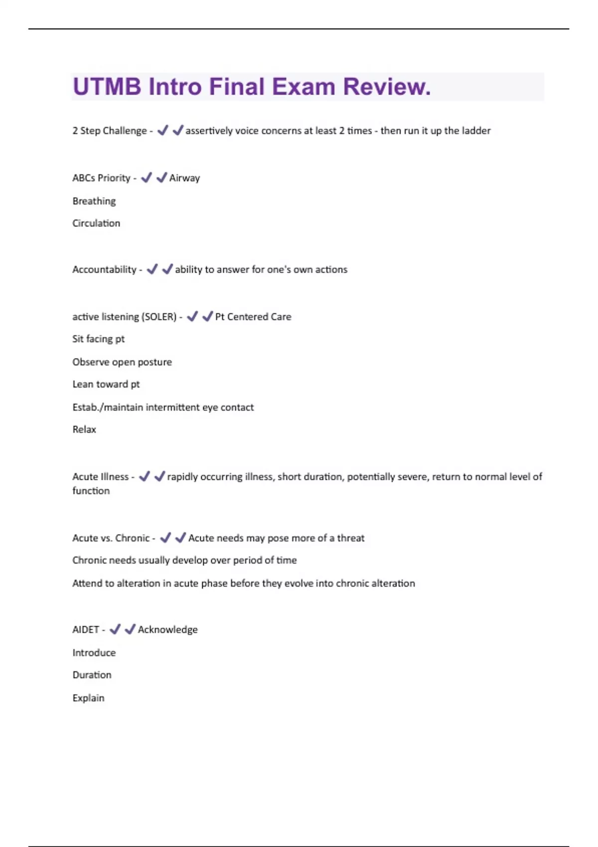 2 Step Challenge - assertively voice concerns at least 2 times - then run it up the ladder ABCs Priority - Airway Breathing Circulation Accountability - ability to answer for one's own actions active listening (SOLER) - Pt Centered Care Sit facing pt Observe open posture Lean toward pt Estab./maintain intermittent eye contact Relax Acute Illness - rapidly occurring illness, short duration, potentially severe, return to normal level of function Acute vs. Chronic - Acute needs may pose more of a threat Chronic needs usually develop over period of time Attend to alteration in acute phase before they evolve into chronic alteration AIDET - Acknowledge Introduce Duration ExplainThank you Anxiety - Worry, nervousness, unease about imminent event with uncertain outcome Anxiety levels - Mild: everyday tension Moderate: perceptual field begins to narrow Severe: perception is impaired, can only focus on one thing Panic: Out of control feeling Assault - threat or attempt to injure autonomy - Self-governance, people have the right to make their own decisions (i.e. surgical consent) Barton - first president of American Red Cross Battery - physical harm Beneficence - Doing good - RN obligated to do actions that benefit pt. BON Purpose - To protect and promote welfare of people in Texas ensuring that each person who holds a license as a nurse is competent to practice safely. (SAFETY) Boundary Crossing - a departure from a commonly accepted practice that could potentially benefit a client (non-exploitative) Boundary Violation - a serious breach that results in harm to clients and is therefore unethical (exploitative)Brief (team events) - Before - share the plan, anticipate outcomes, assign roles Call out - inform team member of emergent situation, allows for anticipation of next step, gives person direct responsibility to a person for each task (CPR - "You call 911") Caring Touch - influences comfort & security, enhances self esteem, increases confidence, improves mental health, Builds pt rapport Check back - double check what you heard is in fact correct Chronic Illness - persists, usually longer than 6 months, is irreversible, and affects functioning in one or more systems Clinical Judgement - The decision made regarding a course of action based on a critical analysis of data when nursing knowledge is applied to a clinical situation Clinical Reasoning - Analyzing clinical situations, then making a decision based on analysis. (Critical thinking) Cross monitoring - An error reduction strategy that involves: * Monitoring actions of other team members * Providing a safety net within the team * Ensuring mistakes or oversights are caught quickly and easily * "Watching each others backs"