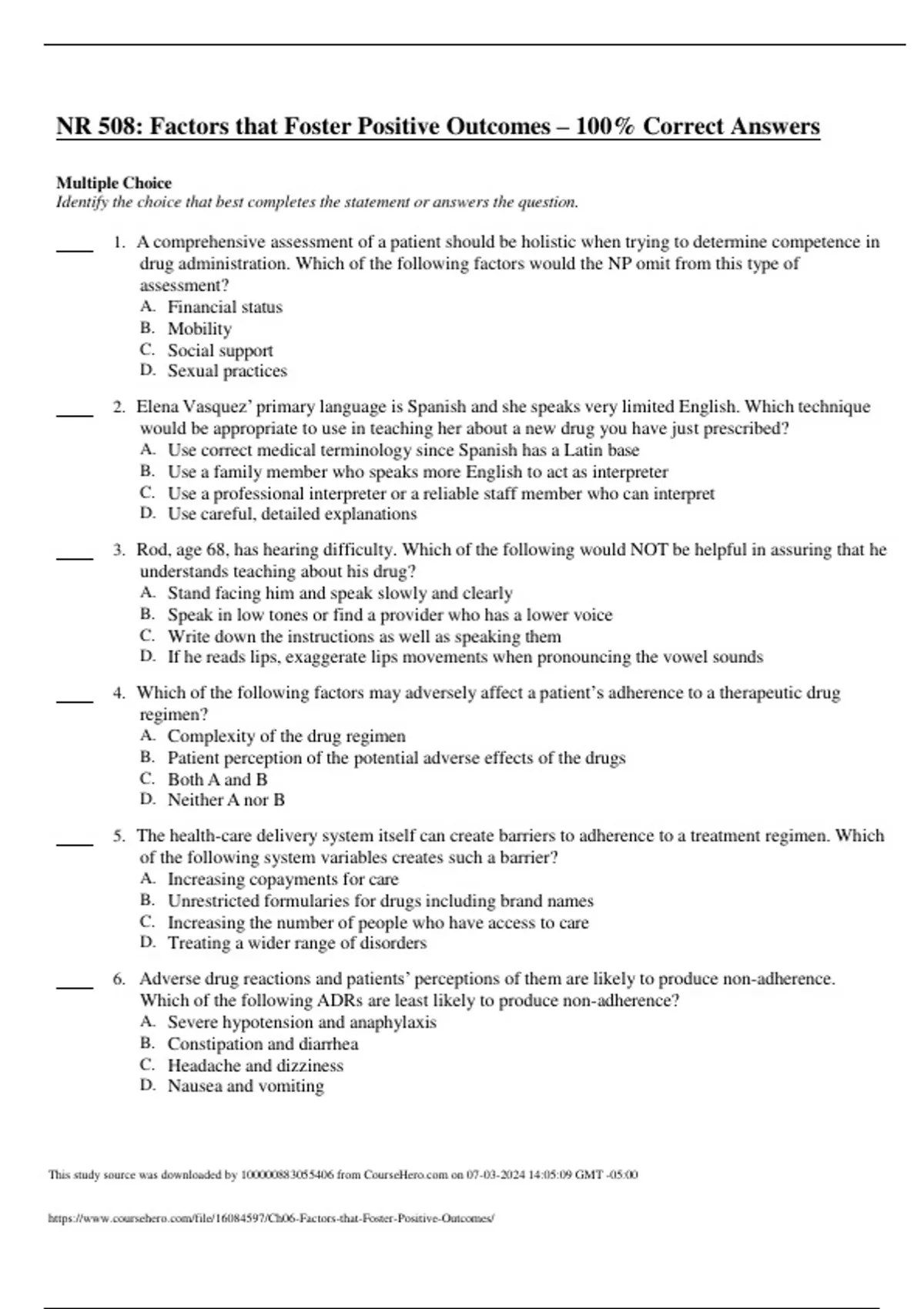 NR 508: Factors that Foster Positive Outcomes – 100% Correct Answers Multiple Choice Identify the choice that best completes the statement or answers the question. 1. A comprehensive assess ment of a patient should be holistic when trying to determine competence in drug administration. Which of the following factors would the NP omit from this type of assessment? A. Financial status B. Mobility C. Social support D. Sexual practices 2. Elena Vasquez’ primary language is Spanish and she speaks very limited English. Which technique would be appropriate to use in teaching her about a new drug you have just prescribed? A. Use correct medical terminology since Spanish has a Latin base B. Use a family member who speaks more English to act as interpreter C. Use a professional interpreter or a reliable staff member who can interpret D. Use careful, detailed explanations 3. Rod, age 68, has hearing difficulty. Which of the following would NOT be helpful in assuring that he understands teaching about his drug? A. Stand facing him and speak slowly and clearly B. Speak in low tones or find a provider who has a lower voice C. Write down the instructions as well as speaking them D. If he reads lips, exaggerate lips movements when pronouncing the vowel sounds 4. Which of the following factors may adversely affect a patient’s adherence to a therapeutic drug regimen? A. Complexity of the drug regimen B. Patient perception of the potential adverse effects of the drugs C. Both A and B D. Neither A nor B 5. The health-care delivery system itself can create barriers to adherence to a treatment regimen. Which of the following system variables creates such a barrier? A. Increasing copayments for care B. Unrestricted formularies for drugs including brand names C. Increasing the number of people who have access to care D. Treating a wider range of disorders 6. Adverse drug reactions and patients’ perceptions of them are likely to produce non-adherence. Which of the following ADRs are least likely to produce non-adherence? A. Severe hypotension and anaphylaxis B. Constipation and diarrhea C. Headache and dizziness D. Nausea and vomiting 7. Ralph’s blood pressure remains elevated despite increased doses of his drug. The NP is concerned that he might not be adhering to his treatment regimen. Which of the following events would suggest that he might not be adherent? A. Ralph states that he always takes the drug “when I feel my pressure is going up.” B. Ralph contacts his NP to discuss the need to increase the dose. C. Ralph consistently keeps his follow-up appointments to check his blood pressure. D. All of the above show that he is adherent to the drug regimen. 8. Non-adherence is especially common in drugs that treat asymptomatic conditions, such as hypertension. One way to reduce the likelihood of non-adherence to these drugs is to prescribe a drug that: A. Has a short half-life so that missing one dose has limited effect B. Requires several dosage titrations so that missed doses can be replaced with lower doses to keep costs down. C. Has a tolerability profile with less of the adverse effects that are considered “irritating,” such as nausea and dizziness. D. Must be taken no more than twice a day. 9. Factors in chronic conditions that contribute to non-adherence include: A. The complexity of the treatment regimen B. The length of time over which it must be taken C. Breaks in the usual daily routine, such as vacations and weekends D. All of the above 10. While patient education about their drugs is important, information alone does not necessarily lead to adherence to a drug regimen. Patients report greater adherence when: A. The provider spent a lot of time discussing the drugs with them B. Their concerns and specific area of knowledge deficit were addressed C. They were given written material, such as pamphlets, about the drugs D. The provider used appropriate medical and pharmacologic terms 11. Patients with psychiatric illnesses have adherence rates to their drug regimen between 35% and 60%. To improve adherence in this population, prescribe drugs: A. With a longer half-life so that missed doses produce a longer taper on the drug curve B. In oral formulations that are more easily taken C. That do not require frequent monitoring D. Combined with patient education about the need to adhere even when symptoms are absent 12. Many disorders require multiple drugs to treat them. The more complex the drug regimen, the less likely the patient will adhere to it. Which of the following interventions will NOT improve adherence? A. Have the patient purchase a pill container with compartments for daily or multiple times per day dosing. B. Match the clinic appointment to the next time the drug is to be refilled. C. Write prescriptions for new drugs with shorter times between refills. D. Give the patient a clear drug schedule that the provider devises to fit the characteristic of the drug. 13. Pharmacologic interventions are costly. Patients for whom the cost/benefit variable is especially important include: A. Older adults and those on fixed incomes B. Patients with chronic illnesses C. Patients with copayments for drugs on their insurance D. Patients on public assistance 14. Providers have a responsibility for determining the best plan of care, but patients also have responsibilities. Patients the provider can be assured will carry through on these responsibilities include those who: A. Are well-educated and affluent B. Have chronic conditions C. Self-monitor drug effects on their symptoms D. None of the above guarantee adherence 15. Monitoring adherence can take several forms, including: A. Patient reports from data in a drug diary B. Pill counts C. Lab reports and other diagnostic markers D. All of the above Chapter 6: Factors that Foster Positive Outcomes Answer Section MULTIPLE CHOICE 1. ANS: D PTS: 1 2. ANS: C PTS: 1 3. ANS: D PTS: 1 4. ANS: C PTS: 1 5. ANS: A PTS: 1 6. ANS: A PTS: 1 7. ANS: A PTS: 1 