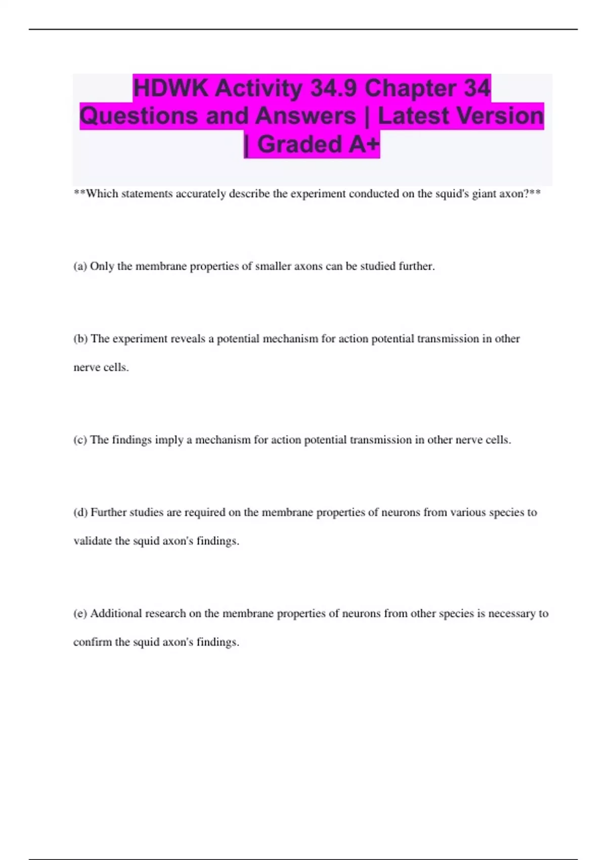 HDWK Activity 34.9 Chapter 34 Questions and Answers | Latest Version | Graded A+ **Which statements accurately describe the experiment conducted on the squid's giant axon?** (a) Only the membrane properties of smaller axons can be studied further. (b) The experiment reveals a potential mechanism for action potential transmission in other nerve cells. (c) The findings imply a mechanism for action potential transmission in other nerve cells. (d) Further studies are required on the membrane properties of neurons from various species to validate the squid axon's findings. (e) Additional research on the membrane properties of neurons from other species is necessary to confirm the squid axon's findings. **(b) The experiment reveals a potential mechanism for action potential transmission in other nerve cells.** **(d) Further studies are required on the membrane properties of neurons from various species to validate the squid axon's findings.** **What methods were used to record the resting membrane potential and action potential of the squid axon? Choose all that apply.** - Using a separate stimulating electrode to depolarize the nerve cell to its threshold potential. - Applying a separate stimulating electrode to hyperpolarize the nerve cell to its threshold potential. - Placing a recording microelectrode inside the cell referenced to a second electrode located outside the cell. - Placing a recording microelectrode adjacent to the outside of the cell referenced to a second electrode. **- Using a separate stimulating electrode to depolarize the nerve cell to its threshold potential.** **- Placing a recording microelectrode inside the cell referenced to a second electrode located outside the cell.** **Which statement serves as an alternative hypothesis for the experiment?** (a) Changes in membrane potential resist movements of charged ions across the membrane. (b) Changes in membrane potential are gradual when a nerve cell transmits an action potential. (c) Changes in membrane potential occur rapidly to signal an action potential. (d) Changes in membrane potential depend on movements of ions within cellular compartments. **(d) Changes in membrane potential depend on movements of ions within cellular compartments.** **According to the graph in the figure, which statements