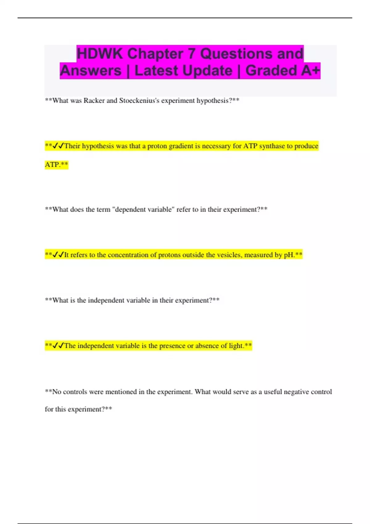 HDWK Chapter 7 Questions and Answers | Latest Update | Graded A+ **What was Racker and Stoeckenius's experiment hypothesis?** **Their hypothesis was that a proton gradient is necessary for ATP synthase to produce ATP.** **What does the term "dependent variable" refer to in their experiment?** **It refers to the concentration of protons outside the vesicles, measured by pH.** **What is the independent variable in their experiment?** **The independent variable is the presence or absence of light.** **No controls were mentioned in the experiment. What would serve as a useful negative control for this experiment?** **Using vesicles that do not contain ATP synthase, maintaining vesicles in the dark, and excluding protons from outside the vesicles.** **In their findings, ATP production in the light was 594 units and in the dark was 23 units. Approximately how much more ATP was produced in the light compared to the dark?** **ATP production in the light was approximately 25 times higher than in the dark.** **In their findings, ATP production in the light was 594 units and in the dark was 23 units. What was the mean ATP production across both conditions?** **The mean ATP production was 309 units.** **The researchers observed that ATP synthesis increased when light was present compared to when it was absent. How would you describe this relationship between light and ATP synthesis?** **This relationship can be described as a positive correlation.** **pH measures the acidity of a solution and is the negative logarithm of proton concentration. When light activates the proton pump, what happens to pH inside and outside the vesicle?** **pH decreases inside the vesicle and increases outside the vesicle.** **Based on the graph and table results, what conclusion did the researchers draw regarding their initial hypothesis?** **They found support for their initial hypothesis.**