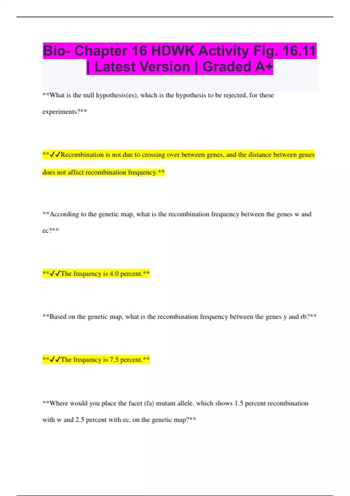 Bio- Chapter 16 HDWK Activity Fig. 16.11 | Latest Version | Graded A+ **What is the null hypothesis(es), which is the hypothesis to be rejected, for these experiments?** **Recombination is not due to crossing over between genes, and the distance between genes does not affect recombination frequency.** **According to the genetic map, what is the recombination frequency between the genes w and ec?** **The frequency is 4.0 percent.** **Based on the genetic map, what is the recombination frequency between the genes y and rb?** **The frequency is 7.5 percent.** **Where would you place the facet (fa) mutant allele, which shows 1.5 percent recombination with w and 2.5 percent with ec, on the genetic map?** **fa would be 1.5 map units to the right of w and 2.5 map units to the left of ec.** **Where could the bifid (bi) mutant allele, which shows 2.5 percent recombination with ec, be located on the genetic map?** **bi could be 2.5 map units from ec in either direction.** **Given that the genes u, v, and w are linked, with recombination frequencies of u-v 8.2 percent, v-w 17.3 percent, and u-w 9.1 percent, which gene is positioned in the middle?** **Gene u is in the middle.** **If genes p, q, and r are linked, with a 2.0 percent recombination frequency between p and q, and 6.0 percent between q and r, and gene p is between q and r, what is the recombination frequency between p and r?** **The frequency is 4.0 percent.** **For linked genes p, q, and r, with recombination frequencies of 2.0 percent between p and q, and 6.0 percent between q and r, if gene q is between p and r, what is the recombination frequency between p and r?** **The frequency is 8.0 percent.**