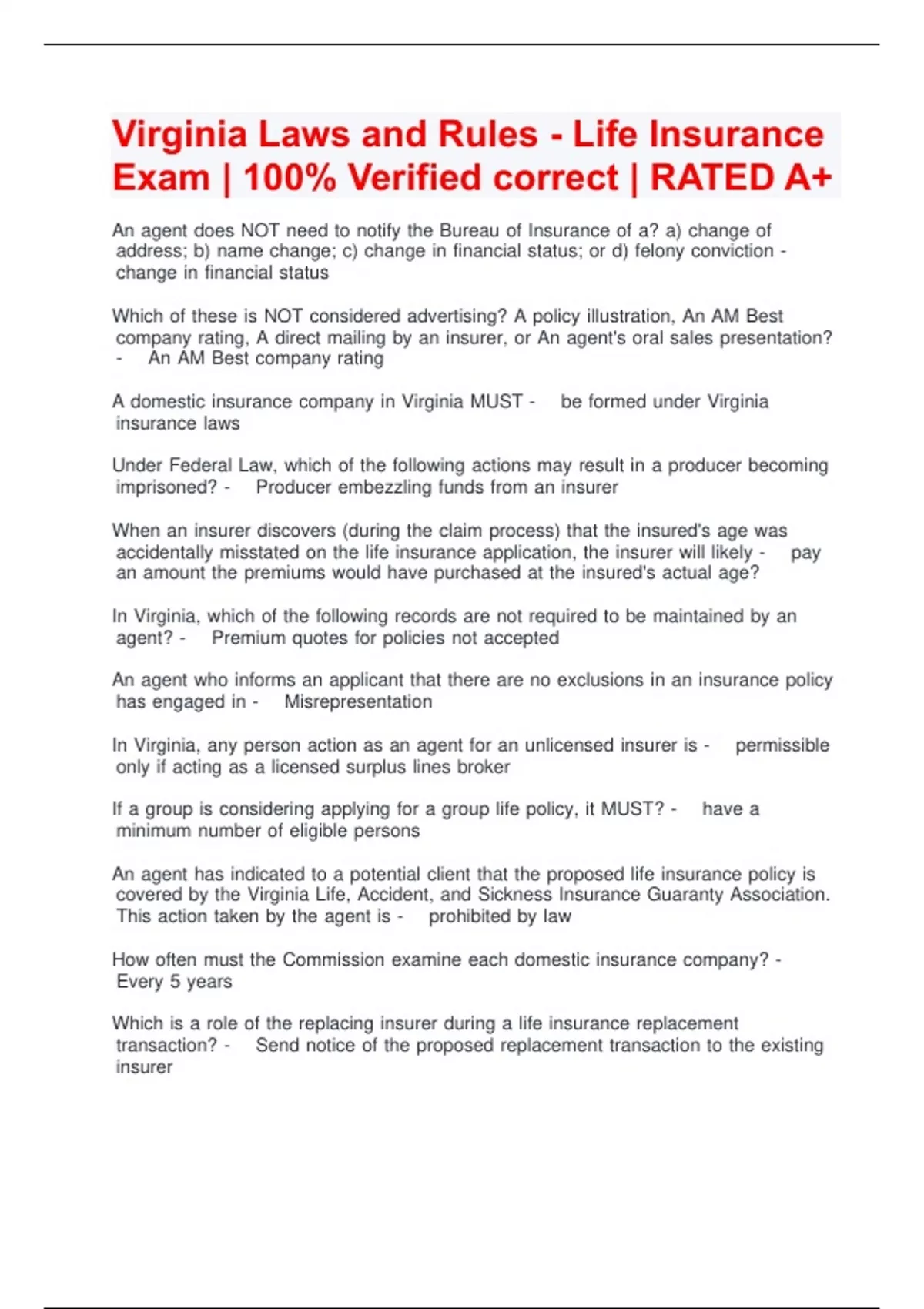 Virginia Laws and Rules - Life Insurance Exam | 100% Verified correct | RATED A+
