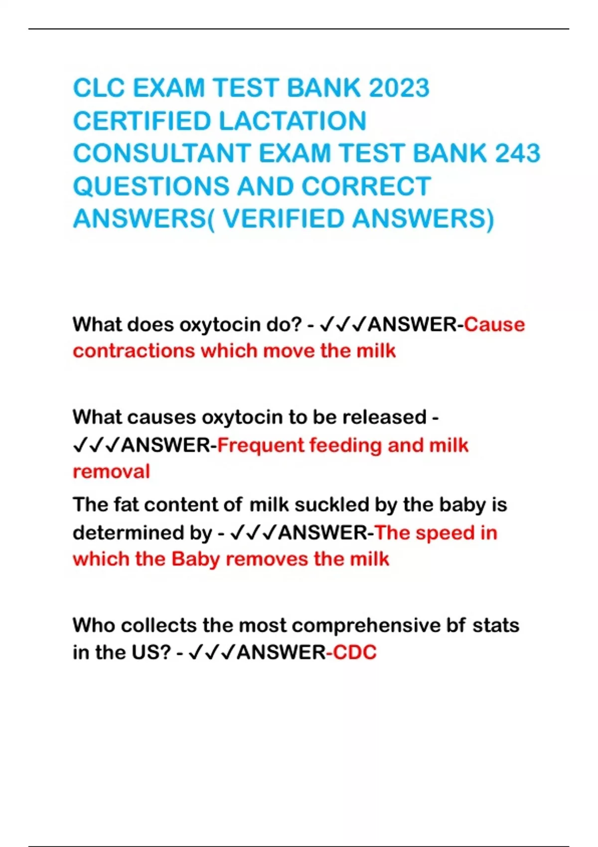 CLC EXAM TEST BANK 2023 CERTIFIED LACTATION CONSULTANT EXAM TEST BANK 243 QUESTIONS AND CORRECT ANSWERS( VERIFIED ANSWERS)