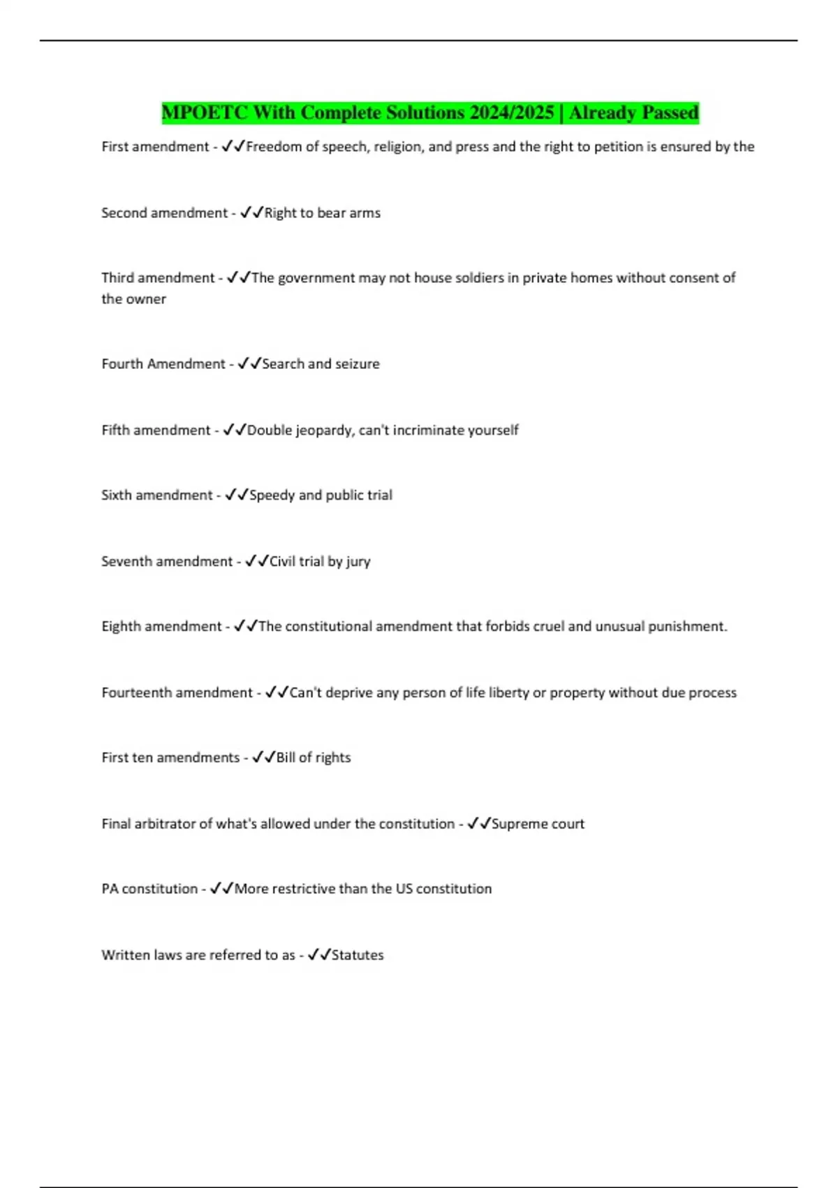 MPOETC With Complete Solutions 2024/2025 | Already Passed First amendment - Freedom of speech, religion, and press and the right to petition is ensured by the Second amendment - Right to bear arms Third amendment - The government may not house soldiers in private homes without consent of the owner Fourth Amendment - Search and seizure Fifth amendment - Double jeopardy, can't incriminate yourself Sixth amendment - Speedy and public trial Seventh amendment - Civil trial by jury Eighth amendment - The constitutional amendment that forbids cruel and unusual punishment. Fourteenth amendment - Can't deprive any person of life liberty or property without due process First ten amendments - Bill of rights Final arbitrator of what's allowed under the constitution - Supreme court PA constitution - More restrictive than the US constitution Written laws are referred to as - Statutes