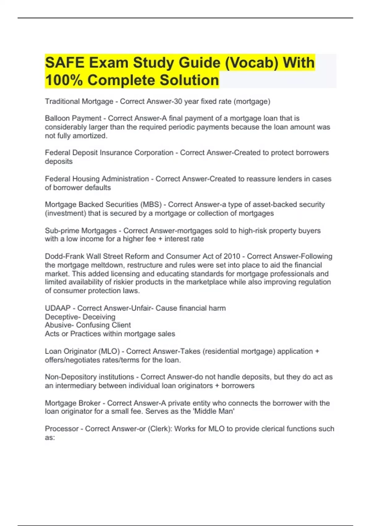 SAFE Exam Study Guide (Vocab) With 100% Complete Solution Traditional Mortgage - Correct Answer-30 year fixed rate (mortgage) Balloon Payment - Correct Answer-A final payment of a mortgage loan that is considerably larger than the required periodic payments because the loan amount was not fully amortized. Federal Deposit Insurance Corporation - Correct Answer-Created to protect borrowers deposits Federal Housing Administration - Correct Answer-Created to reassure lenders in cases of borrower defaults Mortgage Backed Securities (MBS) - Correct Answer-a type of asset-backed security (investment) that is secured by a mortgage or collection of mortgages Sub-prime Mortgages - Correct Answer-mortgages sold to high-risk property buyers with a low income for a higher fee + interest rate Dodd-Frank Wall Street Reform and Consumer Act of 2010 - Correct Answer-Following the mortgage meltdown, restructure and rules were set into place to aid the financial market. This added licensing and educating standards for mortgage professionals and limited availability of riskier products in the marketplace while also improving regulation of consumer protection laws. UDAAP - Correct Answer-Unfair- Cause financial harm Deceptive- Deceiving Abusive- Confusing Client Acts or Practices within mortgage sales Loan Originator (MLO) - Correct Answer-Takes (residential mortgage) application + offers/negotiates rates/terms for the loan. Non-Depository institutions - Correct Answer-do not handle deposits, but they do act as an intermediary between individual loan originators + borrowers Mortgage Broker - Correct Answer-A private entity who connects the borrower with the loan originator for a small fee. Serves as the 'Middle Man' Processor - Correct Answer-or (Clerk): Works for MLO to provide clerical functions such as: Verification of income and tax info to verify what the borrower shared with the LO. Underwriter - Correct Answer-A person who evaluates and classifies risks to accept or reject borrower Appraiser - Correct Answer-An independent person hired to provide an unbiased estimate of value by physical visits or comparing to similar homes within the same market. Appraisal paid for by borrower in their closing cost. Title agent - Correct Answer-Hired by the borrower to research the ownership (title) of the given property and look for any encumbrances. Works out of county record building. Title Insurance - Correct Answer-Protects the lender and borrower with claims against title (ex. faulty title etc) The Four C's - Correct Answer-The main foundational criteria that MLO use to determine if the borrower is qualified for the loan. (each C is a different qualification) Ecumbrance - Correct Answer-A claim or liability against real estate (ex. liens, outstanding claim) Credit - Correct Answer-Financial Character. The borrower's credit score + history. A summary of current debt and a full report of the history of payments. Capacity - Correct Answer-Front end debt to determine the borrower's GMI versus their monthly obligations (noncancellable bills) Cash - Correct Answer-Liquid assets the borrower has available to cover shortfalls, usually in the form of reserves Collateral - Correct Answer-The property pledged as security for the loan itself. The loan amount compared to value Amortization - Correct Answer-the reduction of a loan balance through a period of pre-determined payments made over a period of time Principal - Correct Answer-The amount of the loan. This does NOT include the cost for the loan (interest) or any other taxes on the loan. Escrow - Correct Answer-Account where client monies are held for future payout of regular expenses, such as taxes and insurance premiums/payments Closing Disclosure - Correct Answer-A form that must be provided to the borrower at least three business days before closing- goes into detail about loan and information about the escrow account Closing Agent - Correct Answer-(An attorney or Notary) A third party who prepares the paperwork and coordinates/conducts the closing or settlement.. (** they have no knowledge to inform borrower about loan or terms of loan, MLO must prepare them for this) Acts as a witness to the signatures and take care of filing Negative Amortization - Correct Answer-This occurs when the loan payment is not sufficient to cover the interest cost and results in the unpaid interest being added to the principal (original balance), causing the loan amount to increase. Reverse Mortgage - Correct Answer-Homeowners 62+ can borrow money from the value of their property (if enough equity) to receive a stipend of monthly payments/line of credit. This is paid back with interest when the home is sold or the homeowner dies. Fully Amortized Loan - Correct Answer-A loan to be completely repaid, principal and interest, by a series of regular equal installment payments State Model - Correct Answer-A regulation used that direct states on what codes and regulations should be put into place. As an incentive to adopt the state model, they're given perks and special access to government centers.NOT A LAW. State Authority - Correct Answer-A regulatory authority in a given state who oversees the Safe Act. Names of this person will vary by state. Consumer Financial Protection Bureau (CFPB) - Correct Answer-A government agency within the federal reserves that works to regulate financial products such as: EMPOWERING CONSUMERS (Educate + inform so customers can make better financial decisions), EDUCATE MLO's (ensure loan originators are educated and prepared to make wise financial decisions) and ENFORCE LAWS (ensures no foul play or abusive transactions are occurring) regarding transactions made within the financial industry The jurisdiction in all 50 states but no jurisdiction to revoke or suspend MLO status. Department of Housing and Urban Development (HUD) - Correct Answer-Federal Agency that works to create sustainable, affordable and quality affordable housing for all Americans to equally 