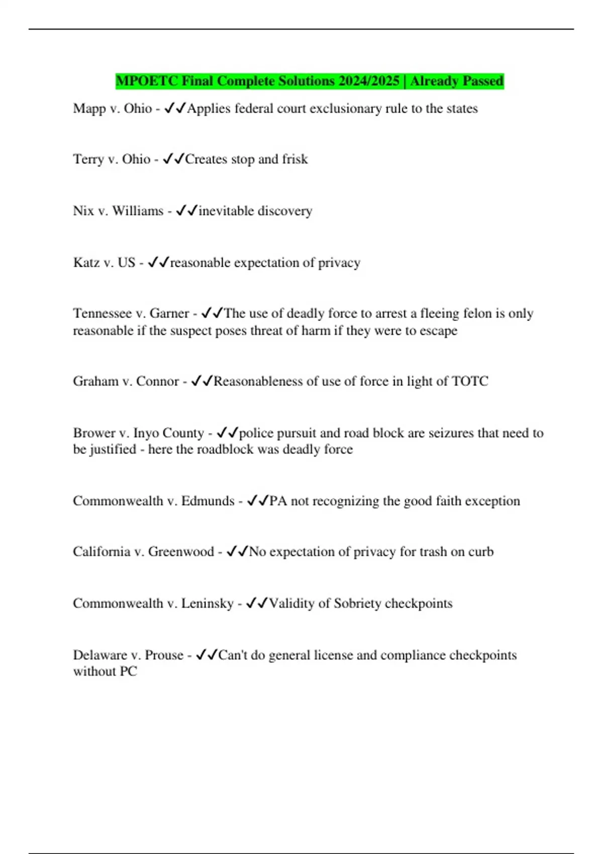 Mapp v. Ohio - Applies federal court exclusionary rule to the states Terry v. Ohio - Creates stop and frisk Nix v. Williams - inevitable discovery Katz v. US - reasonable expectation of privacy Tennessee v. Garner - The use of deadly force to arrest a fleeing felon is only reasonable if the suspect poses threat of harm if they were to escape Graham v. Connor - Reasonableness of use of force in light of TOTC Brower v. Inyo County - police pursuit and road block are seizures that need to be justified - here the roadblock was deadly force Commonwealth v. Edmunds - PA not recognizing the good faith exception