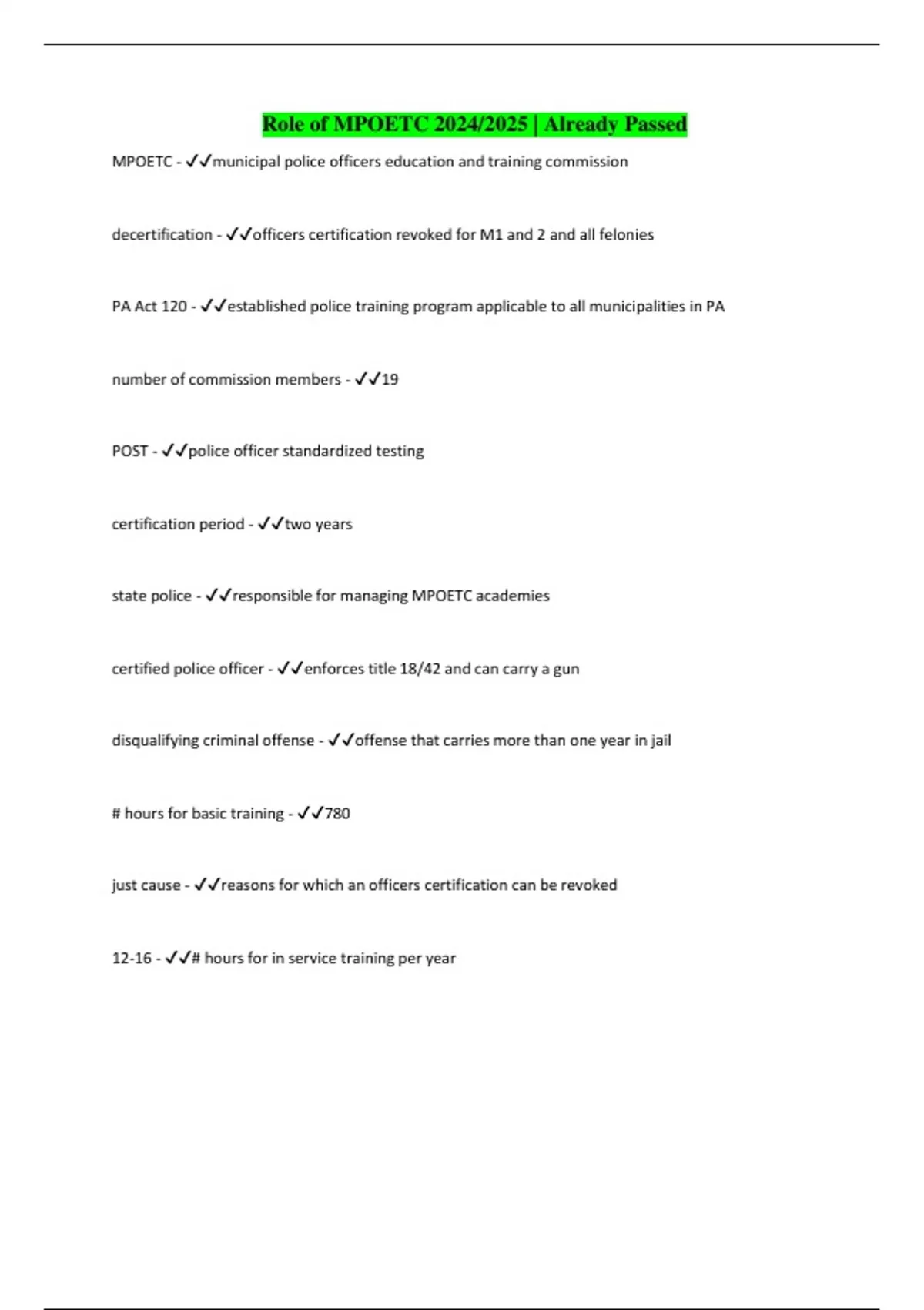 Role of MPOETC 2024/2025 | Already Passed MPOETC - municipal police officers education and training commission decertification - officers certification revoked for M1 and 2 and all felonies PA Act 120 - established police training program applicable to all municipalities in PA number of commission members - 19 POST - police officer standardized testing certification period - two years state police - responsible for managing MPOETC academies certified police officer - enforces title 18/42 and can carry a gun disqualifying criminal offense - offense that carries more than one year in jail # hours for basic training - 780 just cause - reasons for which an officers certification can be revoked 12-16 - # hours for in service training per year