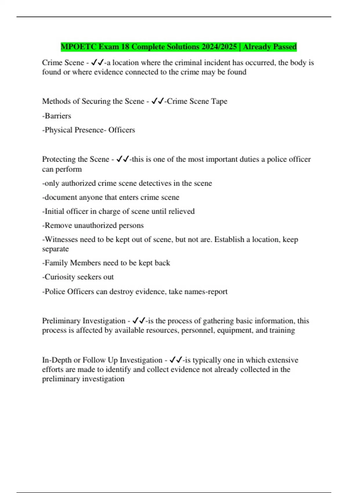 MPOETC Exam 18 Complete Solutions 2024/2025 | Already Passed Crime Scene - -a location where the criminal incident has occurred, the body is found or where evidence connected to the crime may be found Methods of Securing the Scene - -Crime Scene Tape -Barriers -Physical Presence- Officers Protecting the Scene - -this is one of the most important duties a police officer can perform -only authorized crime scene detectives in the scene -document anyone that enters crime scene -Initial officer in charge of scene until relieved -Remove unauthorized persons -Witnesses need to be kept out of scene, but not are. Establish a location, keep separate -Family Members need to be kept back -Curiosity seekers out -Police Officers can destroy evidence, take names-report Preliminary Investigation - -is the process of gathering basic information, this process is affected by available resources, personnel, equipment, and training