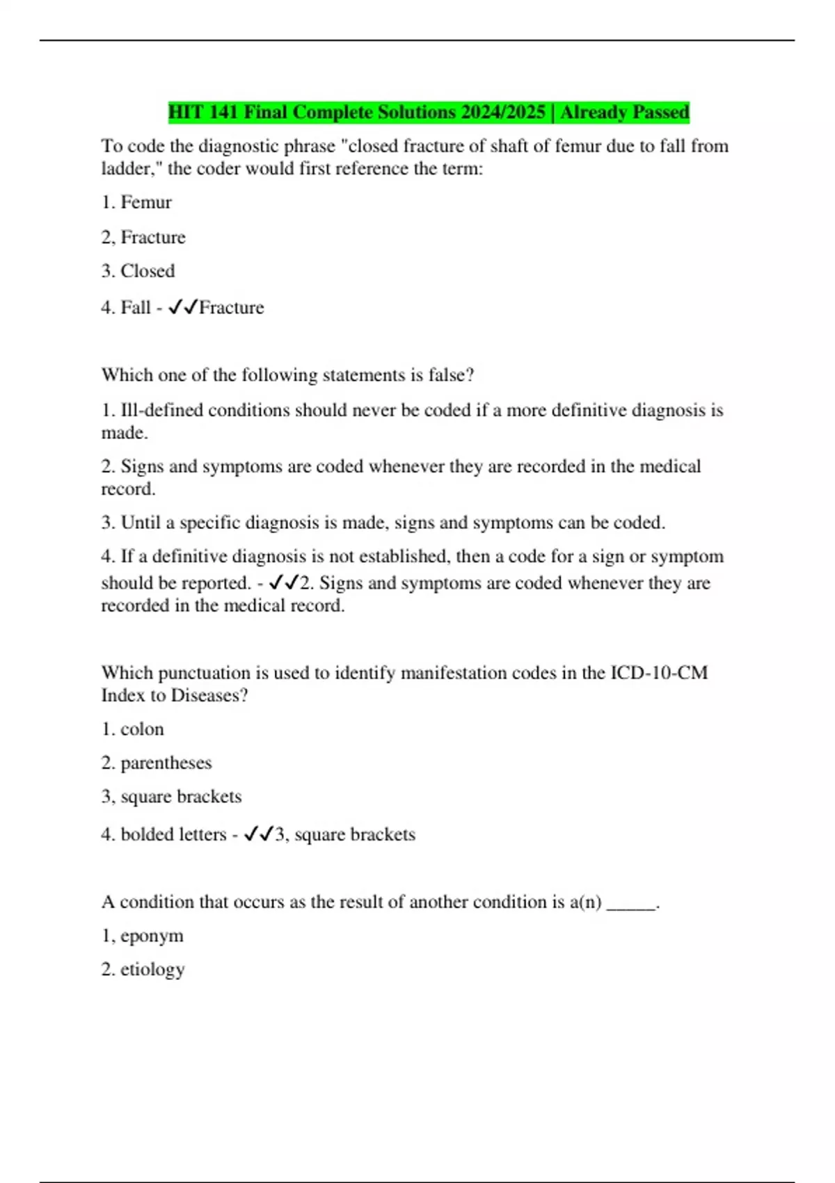To code the diagnostic phrase "closed fracture of shaft of femur due to fall from ladder," the coder would first reference the term: 1. Femur 2, Fracture 3. Closed 4. Fall - Fracture Which one of the following statements is false? 1. Ill-defined conditions should never be coded if a more definitive diagnosis is made. 2. Signs and symptoms are coded whenever they are recorded in the medical record. 3. Until a specific diagnosis is made, signs and symptoms can be coded. 4. If a definitive diagnosis is not established, then a code for a sign or symptom should be reported. - 2. Signs and symptoms are coded whenever they are recorded in the medical record. Which punctuation is used to identify manifestation codes in the ICD-10-CM Index to Diseases? 1. colon 2. parentheses 3, square brackets 4. bolded letters - 3, square brackets