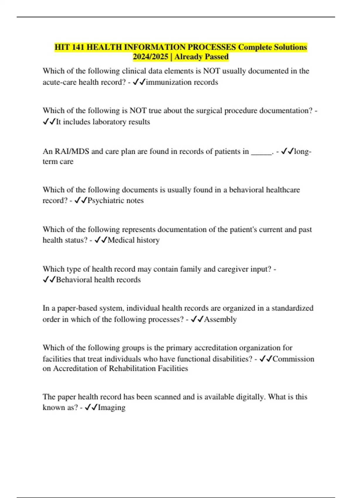 HIT 141 HEALTH INFORMATION PROCESSES Complete Solutions 2024/2025 | Already Passed Which of the following clinical data elements is NOT usually documented in the acute-care health record? - immunization records Which of the following is NOT true about the surgical procedure documentation? - It includes laboratory results An RAI/MDS and care plan are found in records of patients in _____. - long- term care Which of the following documents is usually found in a behavioral healthcare record? - Psychiatric notes Which of the following represents documentation of the patient's current and past health status? - Medical history Which type of health record may contain family and caregiver input? - Behavioral health records In a paper-based system, individual health records are organized in a standardized order in which of the following processes? - Assembly
