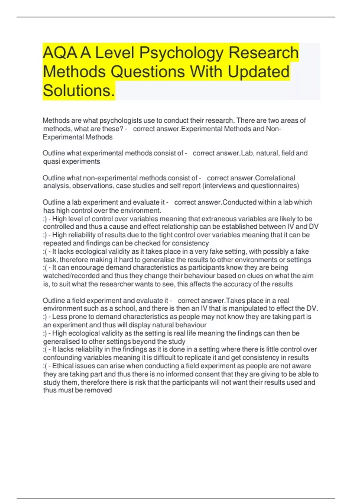 AQA A Level Psychology Research Methods Questions With Updated Solutions.