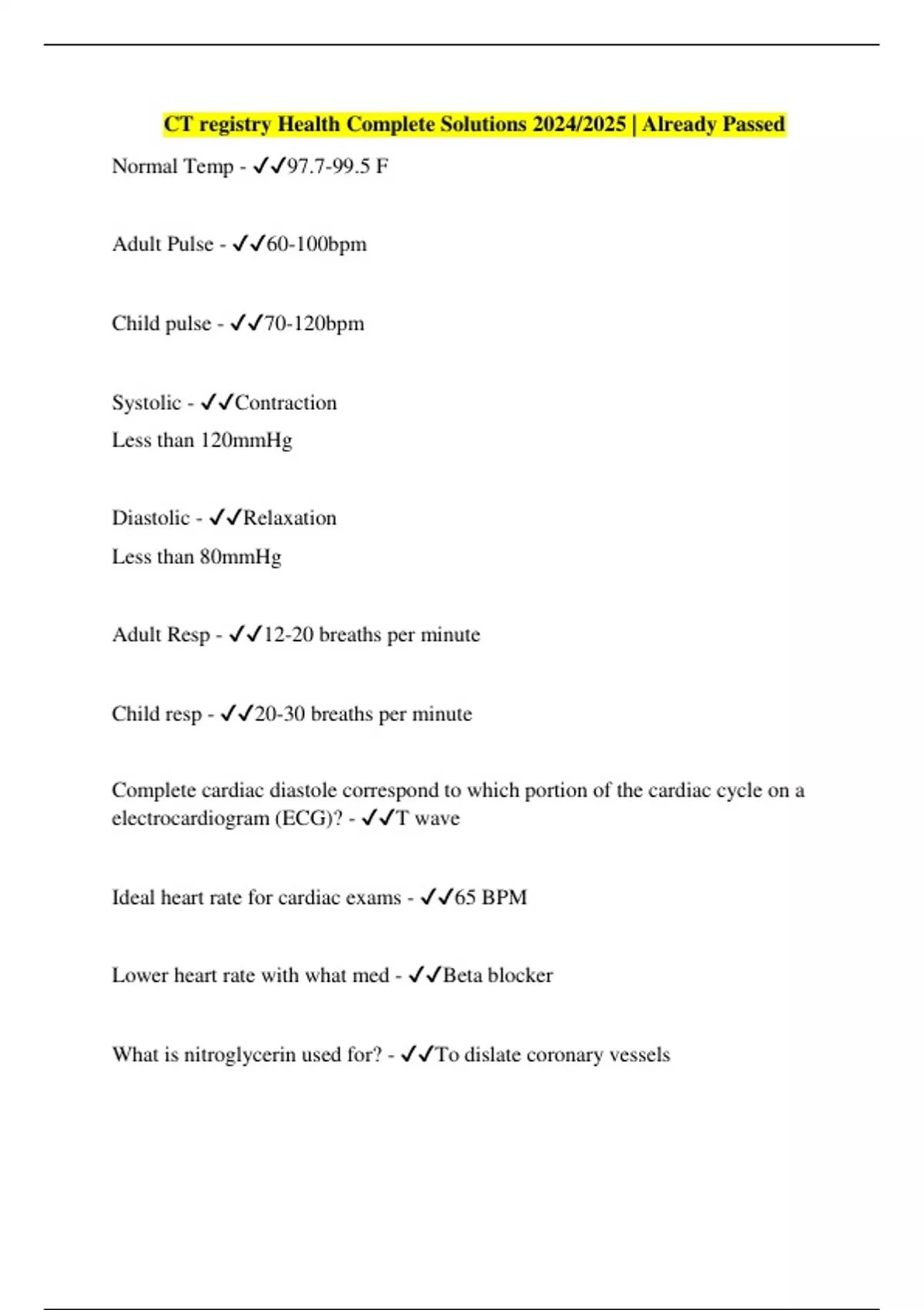 Normal Temp - 97.7-99.5 F Adult Pulse - 60-100bpm Child pulse - 70-120bpm Systolic - Contraction Less than 120mmHg Diastolic - Relaxation Less than 80mmHg Adult Resp - 12-20 breaths per minute Child resp - 20-30 breaths per minute Complete cardiac diastole correspond to which portion of the cardiac cycle on a electrocardiogram (ECG)? - T wave Ideal heart rate for cardiac exams - 65 BPM Lower heart rate with what med - Beta blocker What is nitroglycerin used for? - To dislate coronary vessels