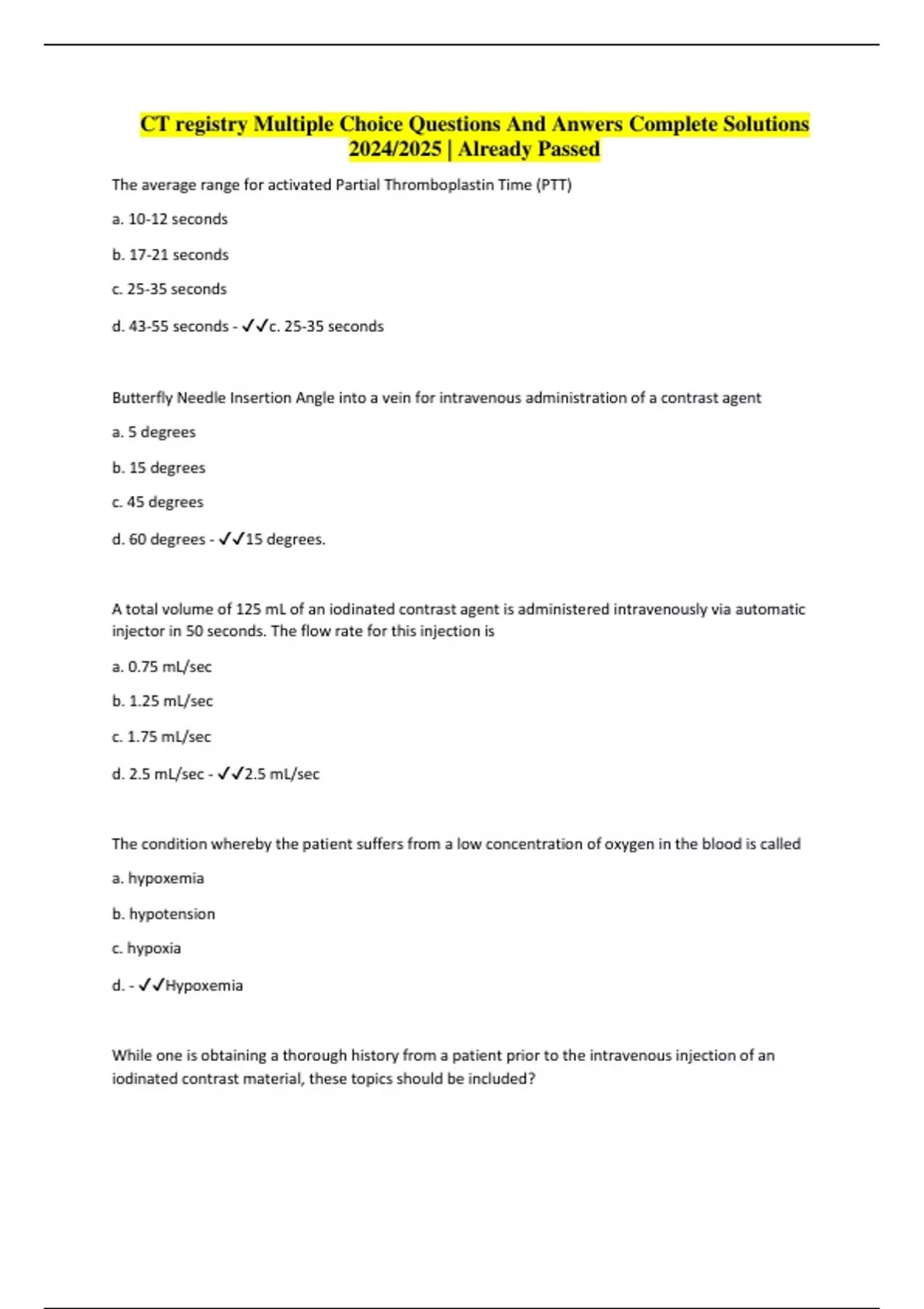 The average range for activated Partial Thromboplastin Time (PTT) a. 10-12 seconds b. 17-21 seconds c. 25-35 seconds d. 43-55 seconds - c. 25-35 seconds Butterfly Needle Insertion Angle into a vein for intravenous administration of a contrast agent a. 5 degrees b. 15 degrees c. 45 degrees d. 60 degrees - 15 degrees. A total volume of 125 mL of an iodinated contrast agent is administered intravenously via automatic injector in 50 seconds. The flow rate for this injection is a. 0.75 mL/sec b. 1.25 mL/sec c. 1.75 mL/sec d. 2.5 mL/sec - 2.5 mL/sec