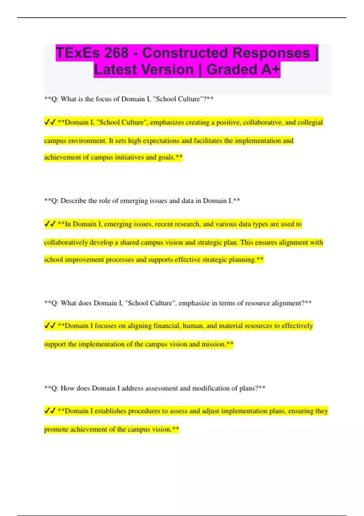 TExEs 268 - Constructed Responses | Latest Version | Graded A+ **Q: What is the focus of Domain I, "School Culture"?** **Domain I, "School Culture", emphasizes creating a positive, collaborative, and collegial campus environment. It sets high expectations and facilitates the implementation and achievement of campus initiatives and goals.** **Q: Describe the role of emerging issues and data in Domain I.** **In Domain I, emerging issues, recent research, and various data types are used to collaboratively develop a shared campus vision and strategic plan. This ensures alignment with school improvement processes and supports effective strategic planning.** **Q: What does Domain I, "School Culture", emphasize in terms of resource alignment?** **Domain I focuses on aligning financial, human, and material resources to effectively support the implementation of the campus vision and mission.** **Q: How does Domain I address assessment and modification of plans?** **Domain I establishes procedures to assess and adjust implementation plans, ensuring they promote achievement of the campus vision.** **Q: What role does continuous development play in Domain I?** **In Domain I, continuous and appropriate development of all stakeholders is modeled and promoted to shape a positive campus culture.** **Q: How does Domain I, "School Culture", promote consistency and inclusivity?** **Domain I establishes and communicates consistent expectations for all stakeholders, fostering a positive campus environment. It implements strategies to gather input from all stakeholders, supporting innovative thinking and an inclusive culture.**DOMAIN I — SCHOOL CULTURE (School and Community Leadership) I. *Creates an atmosphere of safety that encourages the social, emotional, and physical well-being of staff and students DOMAIN I — SCHOOL CULTURE (School and Community Leadership) J. Facilitates the implementation of research-based theories and techniques to promote a campus environment and culture that is conducive to effective teaching and learning and supports organizational health and morale Personal Leadership - Lever 1 Belief Based and Goal Driven Leadership Leader consistently demonstrates belief that every student can achieve at high levels. Personal Leadership - Lever 2 Equity-Focused Leadership Leader continuously dismantles inequitable and exclusionary practices and creates a fully inclusive environment where all children and adults thrive and learn at high levels. Personal Leadership - Lever 3 Interpersonal Leadership Leader builds trusting relationships and facilitates engaged communities of adults and students dedicated to reaching school goals. Personal Leadership - Lever 4 Adaptive Leadership Leader mobilizes others to resolve challenges requiring changes in values, beliefs, assumptions, and habits of behavior. Personal Leadership - Lever 5 Resilient Leadership Leader demonstrates self-awareness, ongoing learning, and resiliency in service