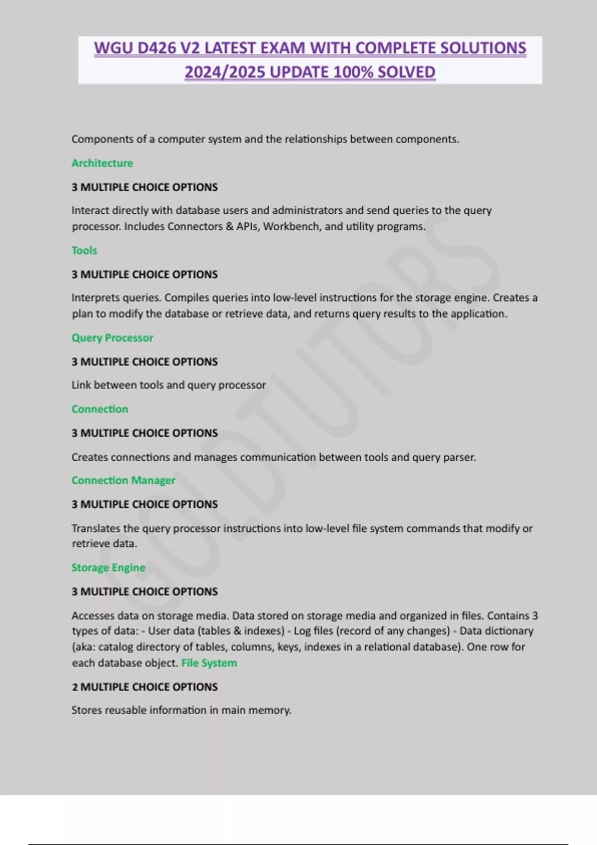WGU D426 V2 LATEST EXAM WITH COMPLETE SOLUTIONS 2024/2025 UPDATE 100% SOLVED Components of a computer system and the relationships between components. Architecture 3 MULTIPLE CHOICE OPTIONS Interact directly with database users and administrators and send queries to the query processor. Includes Connectors & APIs, Workbench, and utility programs. Tools 3 MULTIPLE CHOICE OPTIONS Interprets queries. Compiles queries into low-level instructions for the storage engine. Creates a plan to modify the database or retrieve data, and returns query results to the application. Query Processor 3 MULTIPLE CHOICE OPTIONS Link between tools and query processor
