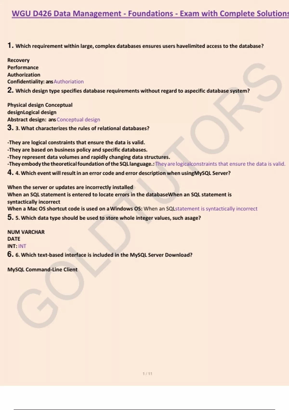 WGU D426 Data Management - Foundations - Exam with Complete Solutions 1. Which requirement within large, complex databases ensures users havelimited access to the database? Recovery Performance Authorization Confidentiality: ans Authoriation 2. Which design type specifies database requirements without regard to aspecific database system? Physical design Conceptual designLogical design Abstract design: ans Conceptual design 3. 3. What characterizes the rules of relational databases?