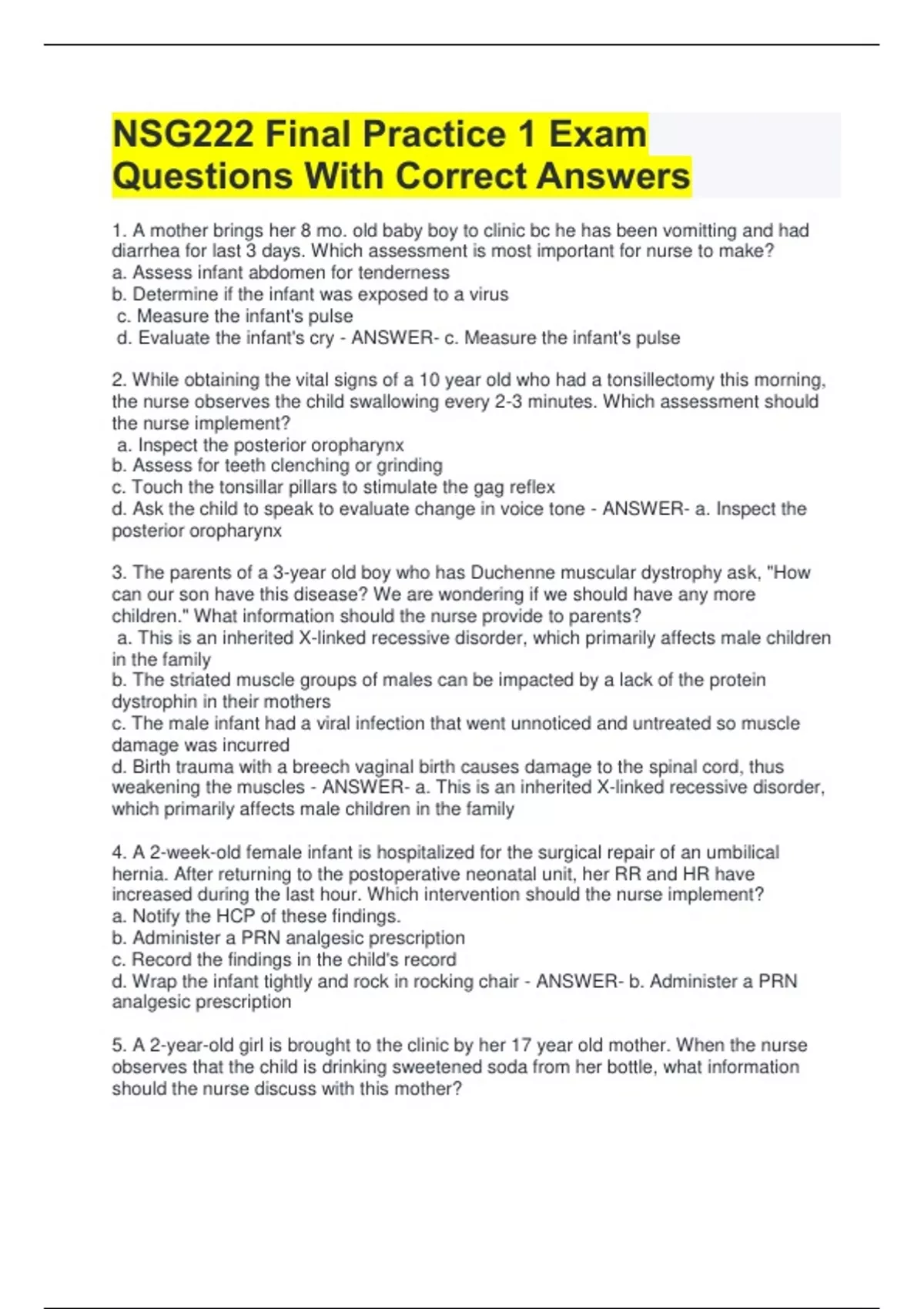 NSG222 Final Practice 1 Exam Questions With Correct Answers 1. A mother brings her 8 mo. old baby boy to clinic bc he has been vomitting and had diarrhea for last 3 days. Which assessment is most important for nurse to make? a. Assess infant abdomen for tenderness b. Determine if the infant was exposed to a virus c. Measure the infant's pulse d. Evaluate the infant's cry - ANSWER- c. Measure the infant's pulse 2. While obtaining the vital signs of a 10 year old who had a tonsillectomy this morning, the nurse observes the child swallowing every 2-3 minutes. Which assessment should the nurse implement? a. Inspect the posterior oropharynx b. Assess for teeth clenching or grinding c. Touch the tonsillar pillars to stimulate the gag reflex d. Ask the child to speak to evaluate change in voice tone - ANSWER- a. Inspect the posterior oropharynx 3. The parents of a 3-year old boy who has Duchenne muscular dystrophy ask, "How can our son have this disease? We are wondering if we should have any more children." What information should the nurse provide to parents? a. This is an inherited X-linked recessive disorder, which primarily affects male children in the family b. The striated muscle groups of males can be impacted by a lack of the protein dystrophin in their mothers c. The male infant had a viral infection that went unnoticed and untreated so muscle damage was incurred d. Birth trauma with a breech vaginal birth causes damage to the spinal cord, thus weakening the muscles - ANSWER- a. This is an inherited X-linked recessive disorder, which primarily affects male children in the family 4. A 2-week-old female infant is hospitalized for the surgical repair of an umbilical hernia. After returning to the postoperative neonatal unit, her RR and HR have increased during the last hour. Which intervention should the nurse implement? a. Notify the HCP of these findings. b. Administer a PRN analgesic prescription c. Record the findings in the child's record d. Wrap the infant tightly and rock in rocking chair - ANSWER- b. Administer a PRN analgesic prescription 5. A 2-year-old girl is brought to the clinic by her 17 year old mother. When the nurse observes that the child is drinking sweetened soda from her bottle, what information should the nurse discuss with this mother? a. A 2-year old should be speaking in 2 word phrases b. Dental caries are associated with drinking soda c. Drinking soda is related to childhood obesity d. Toddlers should be sleeping 10 hours a night e. Toddlers should be drinking from a cup by age 2 - ANSWER- b. Dental caries are associated with drinking soda c. Drinking soda is related to childhood obesity e. Toddlers should be drinking from a cup by age 2