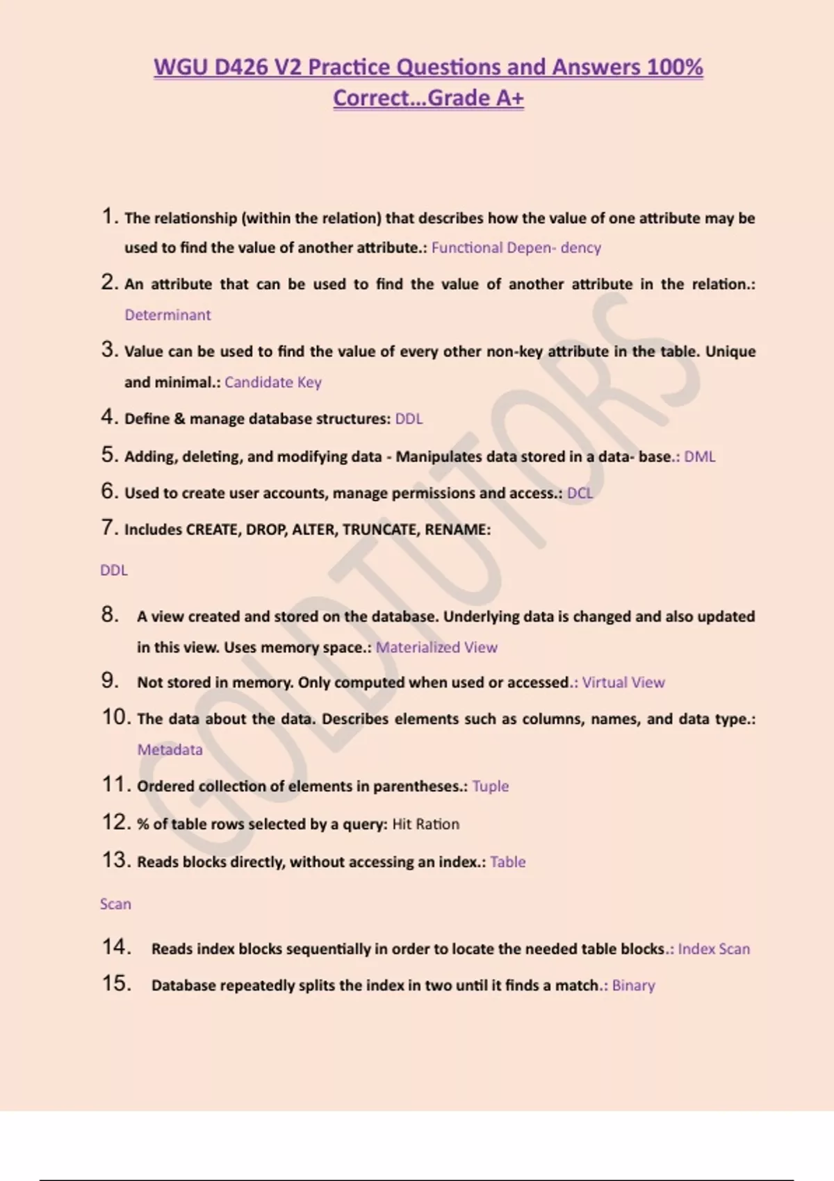 WGU D426 V2 Practice Questions and Answers 100% Correct…Grade A+ 1. The relationship (within the relation) that describes how the value of one attribute may be used to find the value of another attribute.: Functional Depen- dency 2. An attribute that can be used to find the value of another attribute in the relation.: Determinant 3. Value can be used to find the value of every other non-key attribute in the table. Unique and minimal.: Candidate Key 4. Define & manage database structures: DDL 5. Adding, deleting, and modifying data - Manipulates data stored in a data- base.: DML 6. Used to create user accounts, manage permissions and access.: DCL 7. Includes CREATE, DROP, ALTER, TRUNCATE, RENAME: DDL