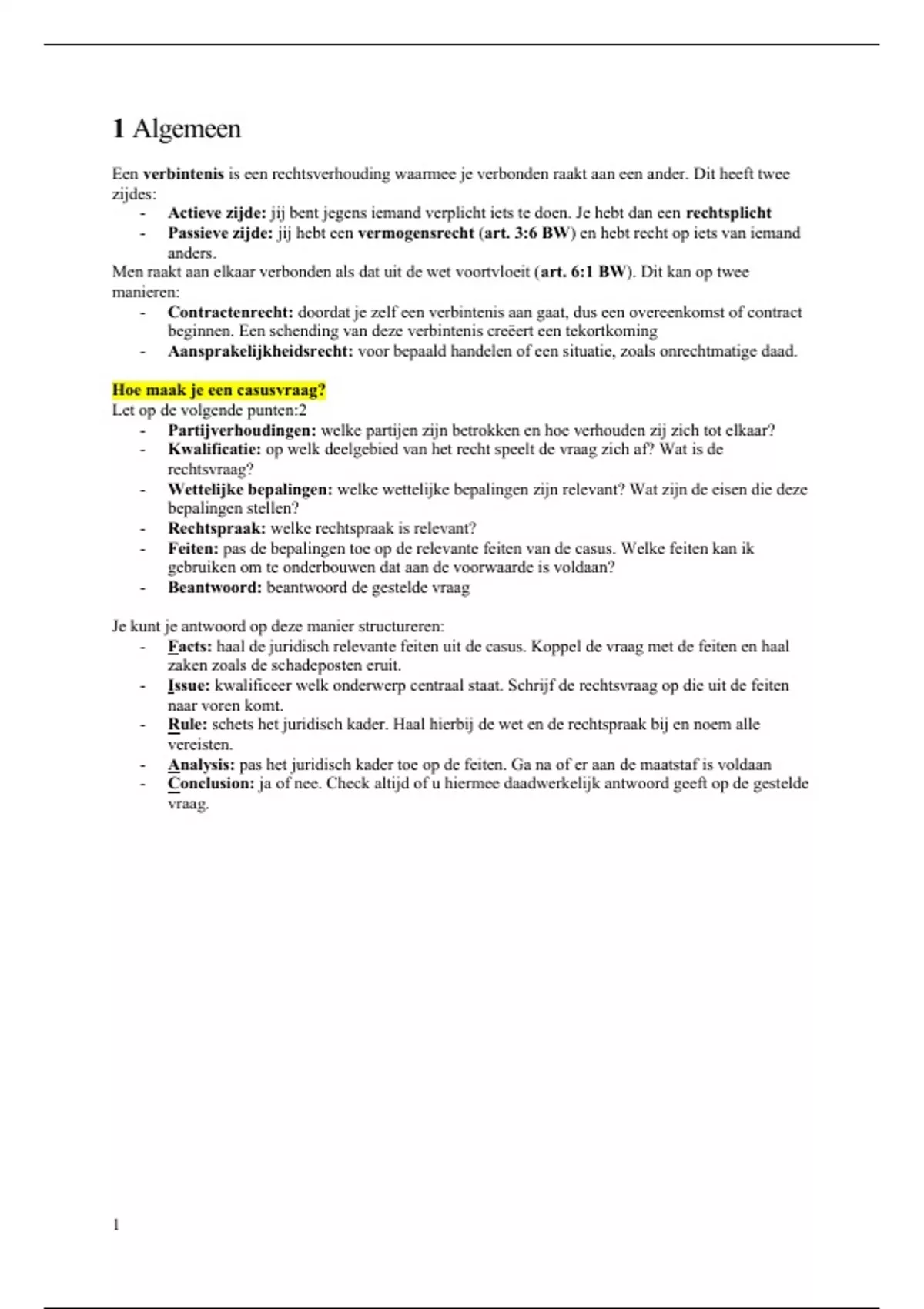 - Facts: haal de juridisch relevante feiten uit de casus. Koppel de vraag met de feiten en haal