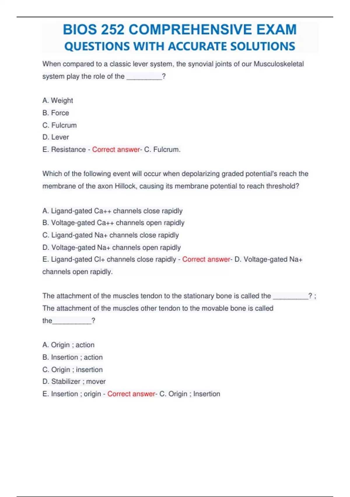 When compared to a classic lever system, the synovial joints of our Musculoskeletal system play the role of the _________? A. Weight B. Force C. Fulcrum D. Lever E. Resistance - Correct answer- C. Fulcrum. Which of the following event will occur when depolarizing graded potential's reach the membrane of the axon Hillock, causing its membrane potential to reach threshold? A. Ligand-gated Ca++ channels close rapidly B. Voltage-gated Ca++ channels open rapidly C. Ligand-gated Na+ channels close rapidly D. Voltage-gated Na+ channels open rapidly E. Ligand-gated Cl+ channels close rapidly - Correct answer- D. Voltage-gated Na+ channels open rapidly.