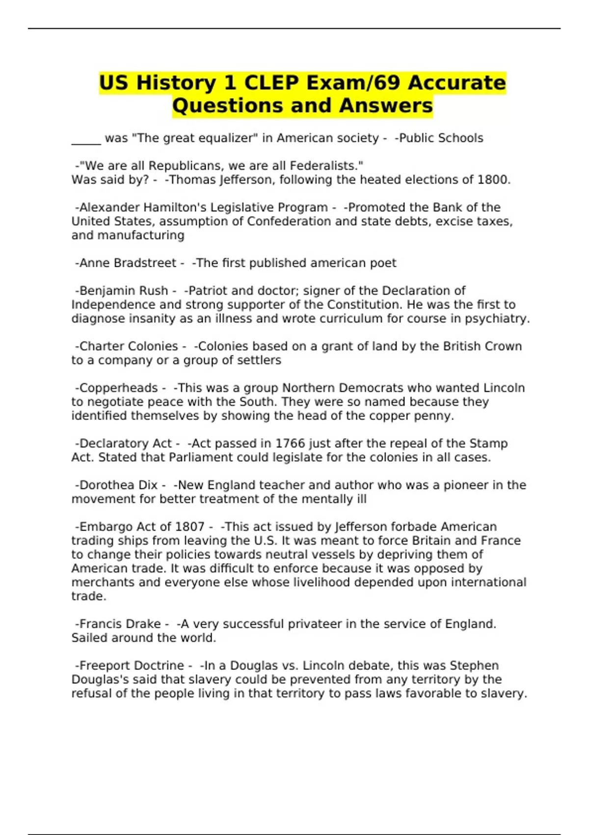 us history 1 clep exam69 accurate questions and a