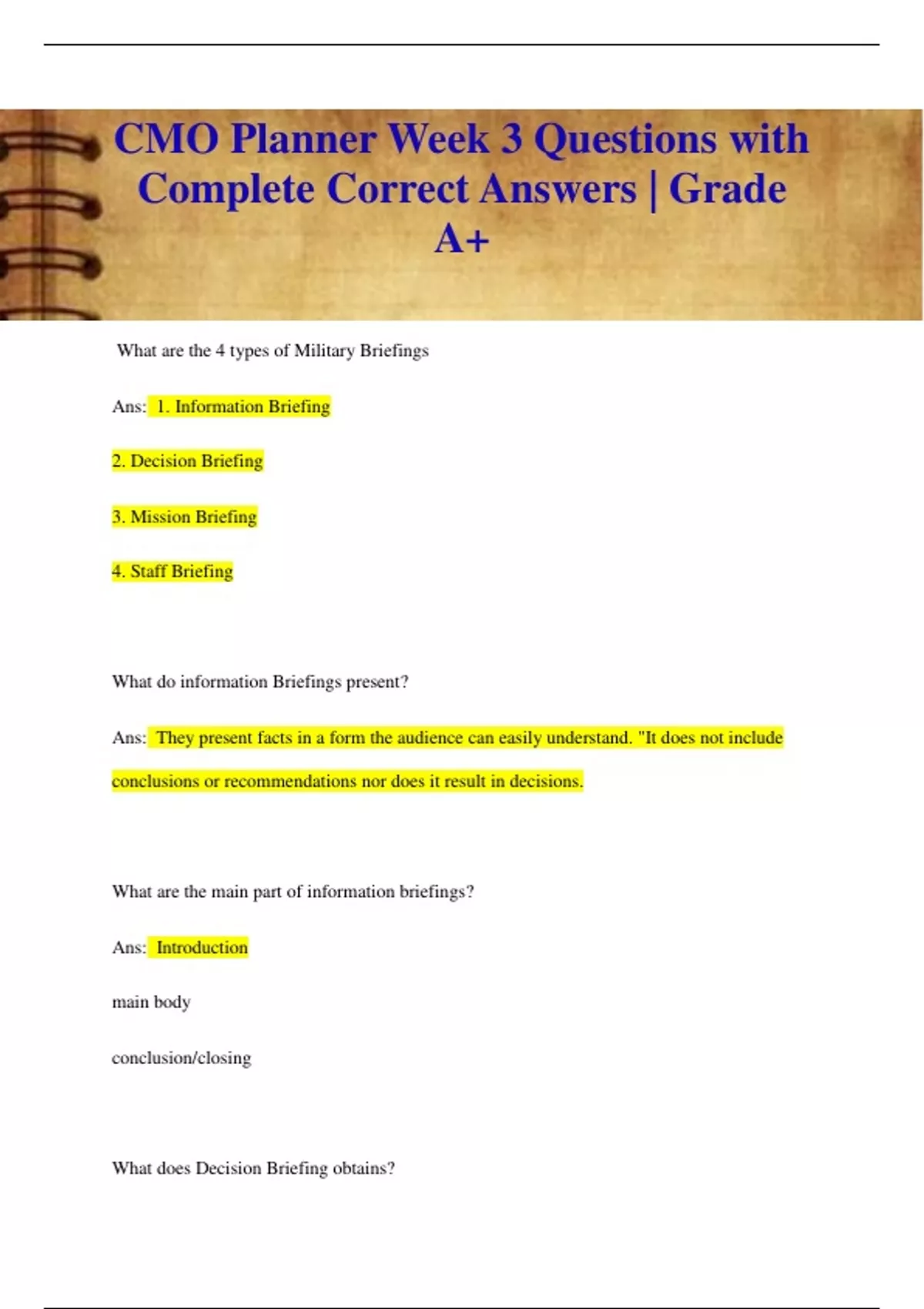 What are the 4 types of Military Briefings Ans: 1. Information Briefing 2. Decision Briefing 3. Mission Briefing 4. Staff Briefing What do information Briefings present? Ans: They present facts in a form the audience can easily understand. "It does not include conclusions or recommendations nor does it result in decisions. What are the main part of information briefings? Ans: Introduction main body conclusion/closing What does Decision Briefing obtains? Ans: They obtain the answer to a question or a decision on a course of action. "The Briefer presents recommended solutions from the analysis or study of a problem. Decision briefings include what Ans: All facts and assumptions relevant to the problem, a discussion of alternatives, analysis based conclusions and any coordination required Mission Briefings? Ans: - are information briefing that occur during operations or training. - They serve to convey critical mission information not provided in the plan or order to individuals or small units What do Mission briefing convey Ans: - Issue or enforce an order - Provide more detailed instructions or requirements - Instill a general appreciation for the mission - review key points for an o