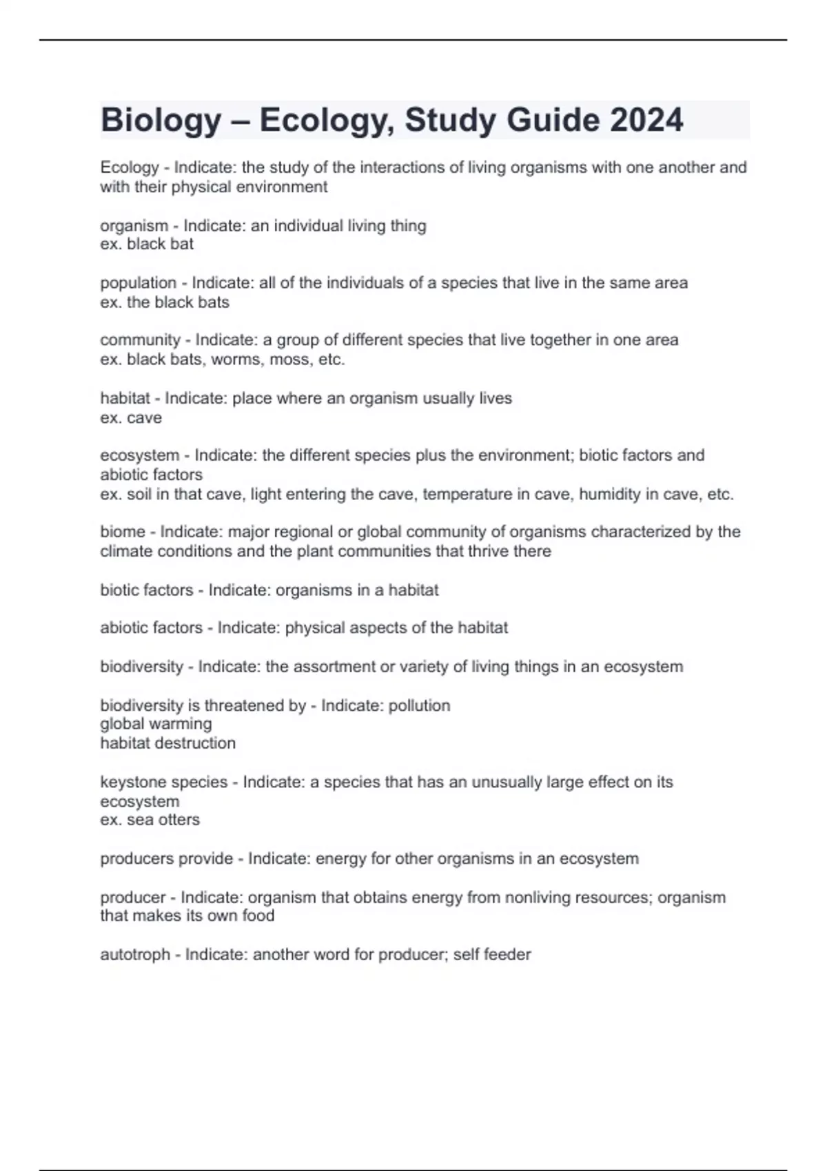 Biology – Ecology, Study Guide 2024 Ecology - Indicate: the study of the interactions of living organisms with one another and with their physical environment organism - Indicate: an individual living thing ex. black bat population - Indicate: all of the individuals of a species that live in the same area ex. the black bats community - Indicate: a group of different species that live together in one area ex. black bats, worms, moss, etc. habitat - Indicate: place where an organism usually lives ex. cave ecosystem - Indicate: the different species plus the environment; biotic factors and abiotic factors ex. soil in that cave, light entering the cave, temperature in cave, humidity in cave, etc. biome - Indicate: major regional or global community of organisms characterized by the climate conditions and the plant communities that thrive there biotic factors - Indicate: organisms in a habitat abiotic factors - Indicate: physical aspects of the habitat biodiversity - Indicate: the assortment or variety of living things in an ecosystem biodiversity is threatened by - Indicate: pollution global warming habitat destruction keystone species - Indicate: a species that has an unusually large effect on its ecosystem ex. sea otters producers provide - Indicate: energy for other organisms in an ecosystem producer - Indicate: organism that obtains energy from nonliving resources; organism that makes its own food autotroph - Indicate: another word for producer; self feeder