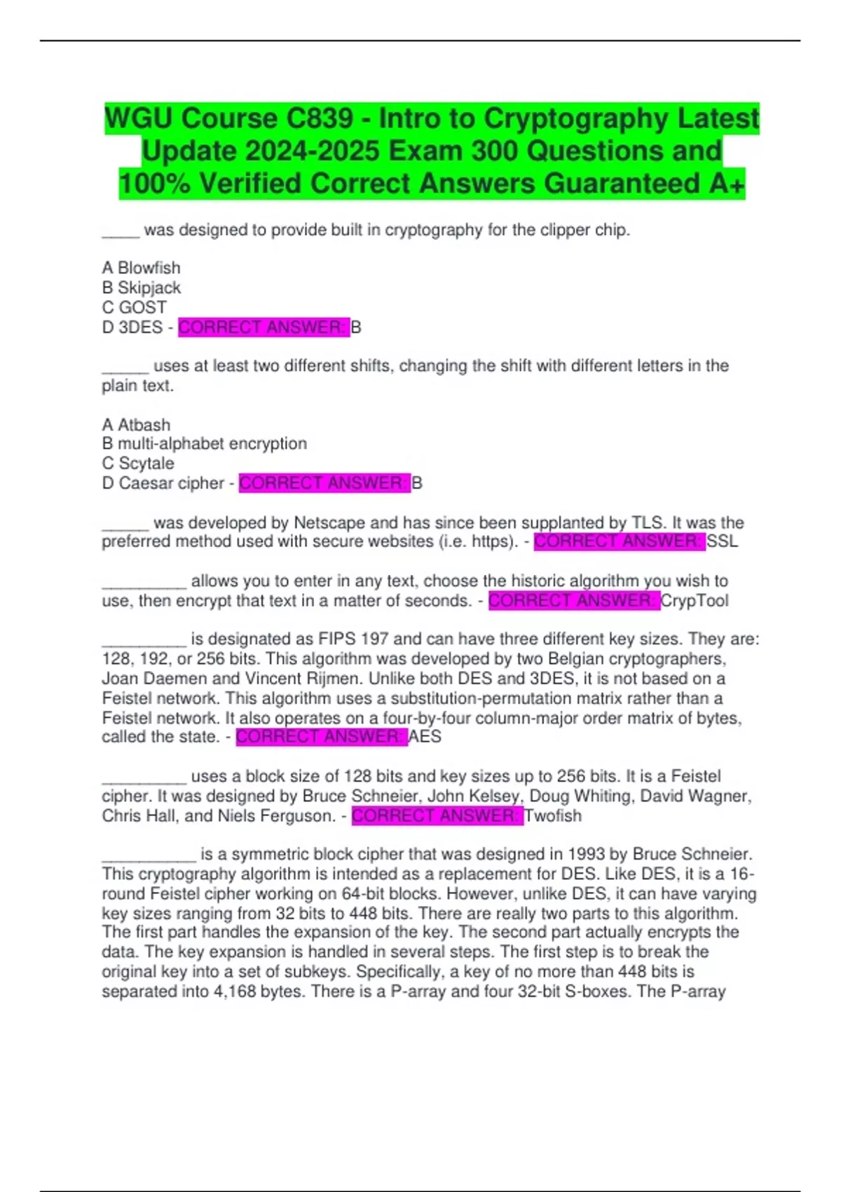 WGU Course C839 - Intro to Cryptography Latest Update Exam 300 Questions and 100% Verified Correct Answers Guaranteed A+